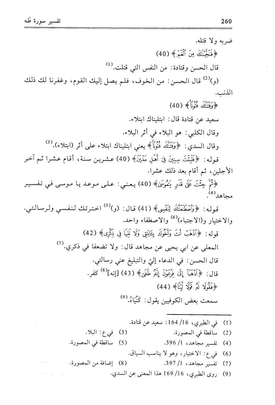{وَفَتَنَّاكَ فُتُونًا} [طه: 40] سَعِيدٌ، عَنْ قَتَادَةَ قَالَ: ابْتَلَيْنَاكَ ابْتِلاءً.