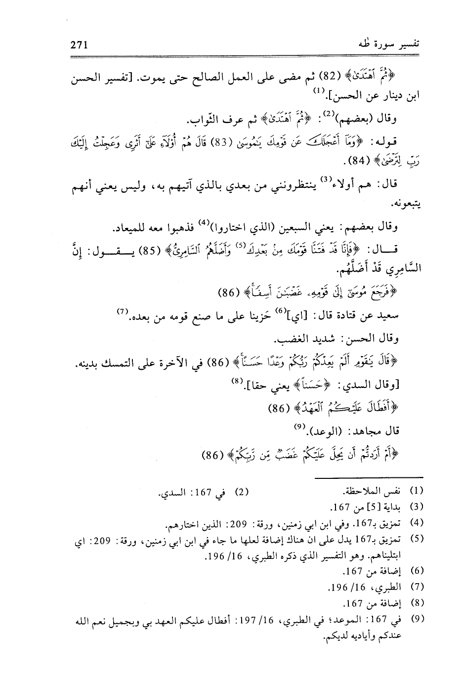{فَرَجَعَ مُوسَى إِلَى قَوْمِهِ غَضْبَانَ أَسِفًا} [طه: 86] سَعِيدٌ، عَنْ قَتَادَةَ قَالَ: أَيْ حَزِينًا عَلَى مَا صَنَعَ قَوْمُهُ مِنْ بَعْدِهِ.