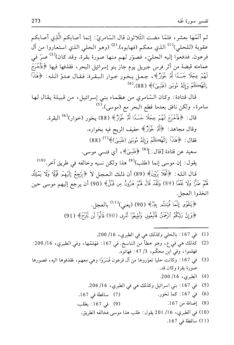 ثُمَّ أَتَمَّهَا بِعَشْرٍ، فَلَمَّا مَضَتِ الثَّلاثُونَ قَالَ السَّامِرِيُّ: إِنَّمَا أَصَابَكُمُ الَّذِي أَصَابَكُمْ عُقُوبَةً لِلْحُلِيِّ الَّذِي مَعَكُمْ فَهَابُوهُ.