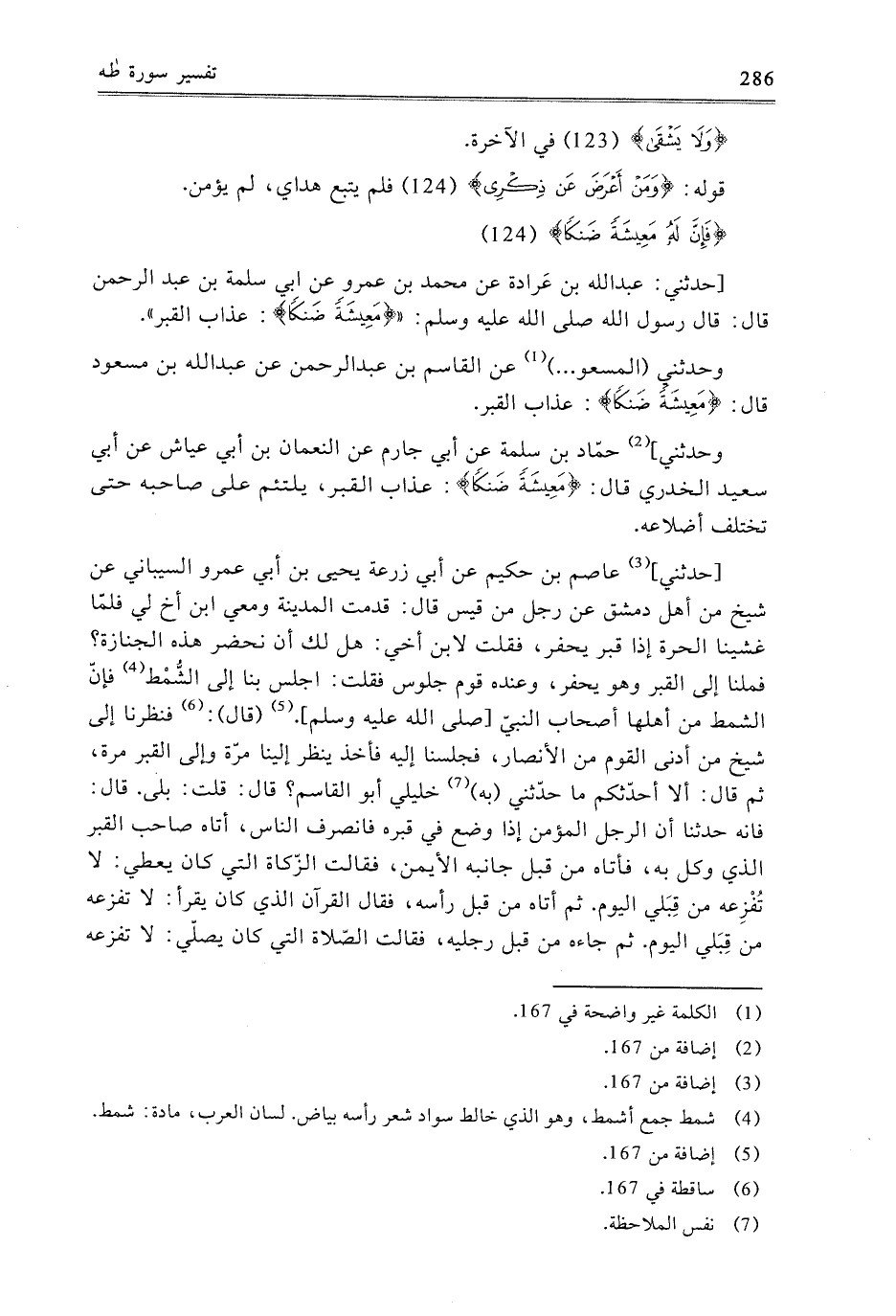 - وَحَدَّثَنِي حَمَّادُ بْنُ سَلَمَةَ، عَنْ أَبِي جَارِمٍ، عَنِ النُّعْمَانِ بْنِ أَبِي عَيَّاشٍ، عَنْ أَبِي سَعِيدٍ الْخُدْرِيِّ قَالَ: {مَعِيشَةً ضَنْكًا} [طه: 124] : عَذَابُ الْقَبْرِ، يَلْتَئِمُ عَلَى صَاحِبِهِ حَتَّى تَخْتَلِفَ أَضْلَاعُهُ.