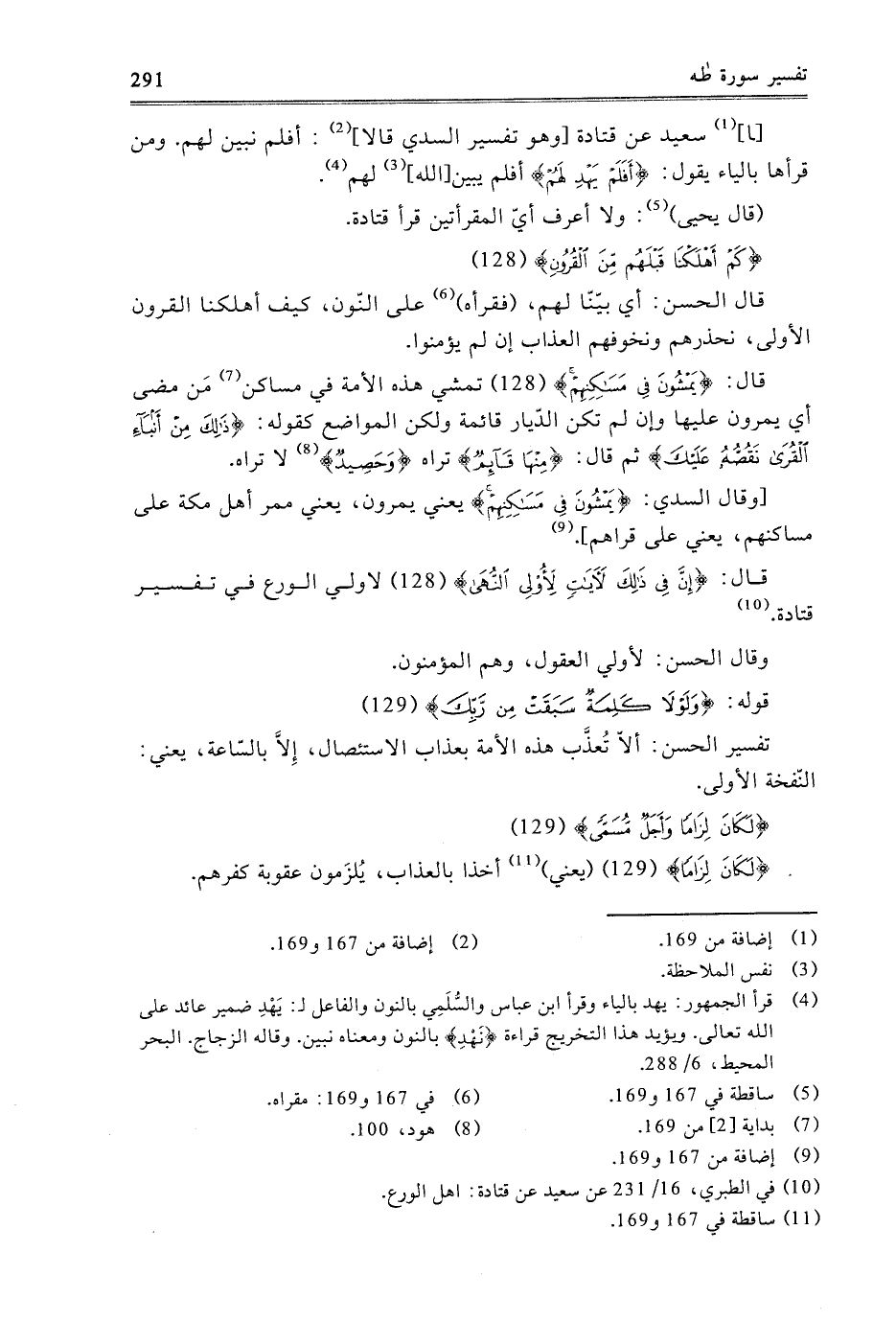 {كَمْ أَهْلَكْنَا قَبْلَهُمْ مِنَ الْقُرُونِ} [طه: 128] قَالَ الْحَسَنُ: أَيْ بَيَّنَّا لَهُمْ، فَقَرَأَهُ عَلَى النُّونِ، كَيْفَ أَهْلَكْنَا الْقُرُونَ الأُولَى، نُحَذِّرُهُمْ وَنُخَوِّفُهُمُ الْعَذَابَ إِنْ لَمْ يُؤْمِنُوا.
