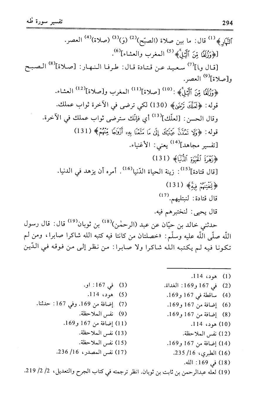 قَالَ: ونا سَعِيدٌ، عَنْ قَتَادَةَ قَالَ: طَرَفَا النَّهَارِ: صَلاةُ الصُّبْحِ وَصَلاةُ الْعَصْرِ.