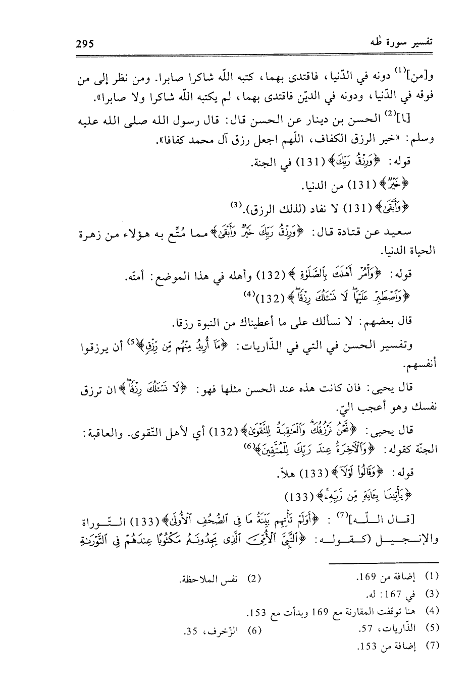 سَعِيدٌ عَنْ قَتَادَةَ قَالَ: {وَرِزْقُ رَبِّكَ خَيْرٌ وَأَبْقَى} [طه: 131] مِمَّا مُتِّعَ بِهِ هَؤُلاءِ مِنْ زَهْرَةِ الْحَيَاةِ الدُّنْيَا.