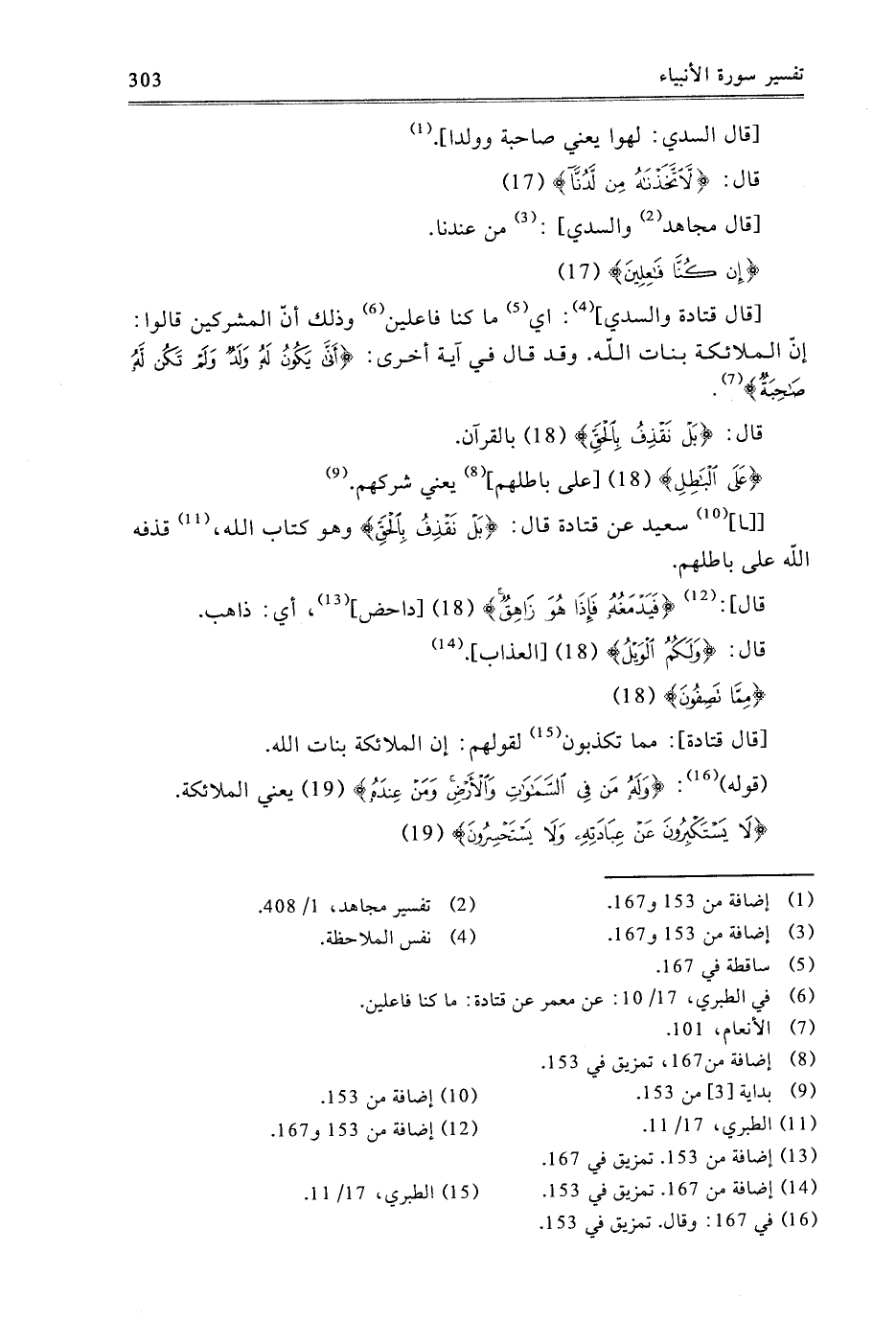 {مِمَّا تَصِفُونَ} [الأنبياء: 18] قَالَ قَتَادَةُ: مِمَّا تَكْذِبُونَ، لِقَوْلِهِمْ: إِنَّ الْمَلائِكَةَ بَنَاتُ اللَّهِ.