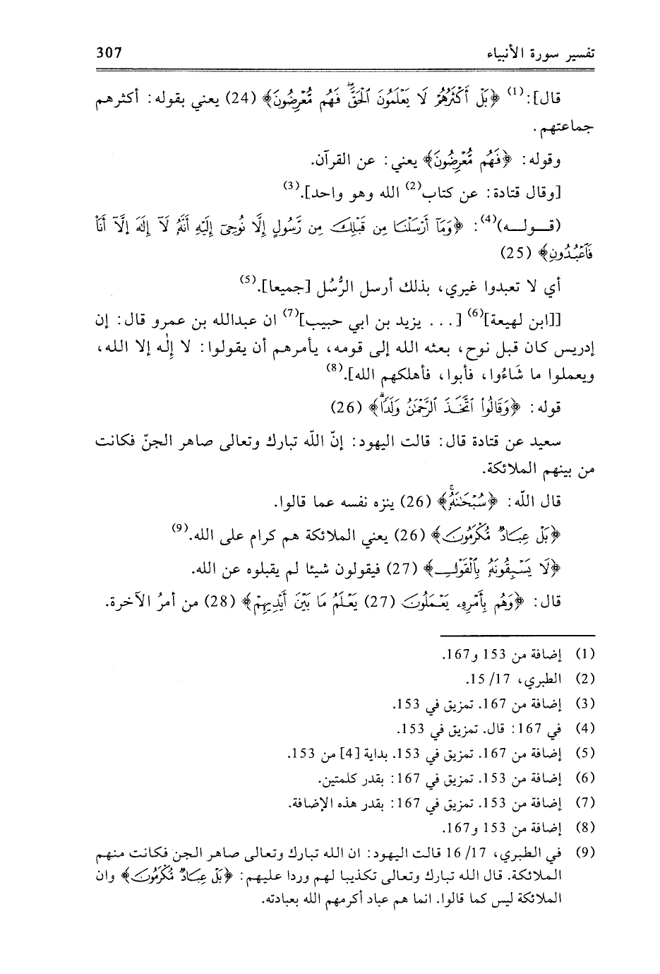 قَوْلُهُ: {وَقَالُوا اتَّخَذَ الرَّحْمَنُ وَلَدًا} [الأنبياء: 26] سَعِيدٌ، عَن قَتَادَةَ قَالَ: قَالَتِ الْيَهُودُ: إِنَّ اللَّهَ تَبَارَكَ وَتَعَالَى صَاهَرَ الْجِنَّ فَكَانَتْ مِنْ بَيْنِهِمُ الْمَلائِكَةُ.