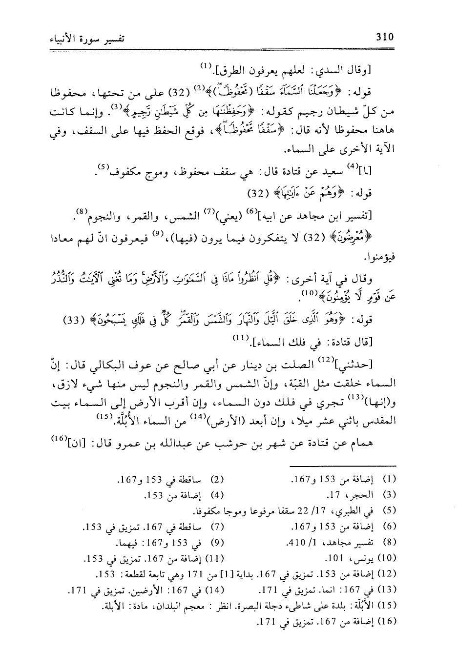نا سَعِيدٌ، عَنْ قَتَادَةَ قَالَ: هِيَ سَقْفٌ مَحْفُوظٌ، وَمَوْجٌ مَكْفُوفٌ.