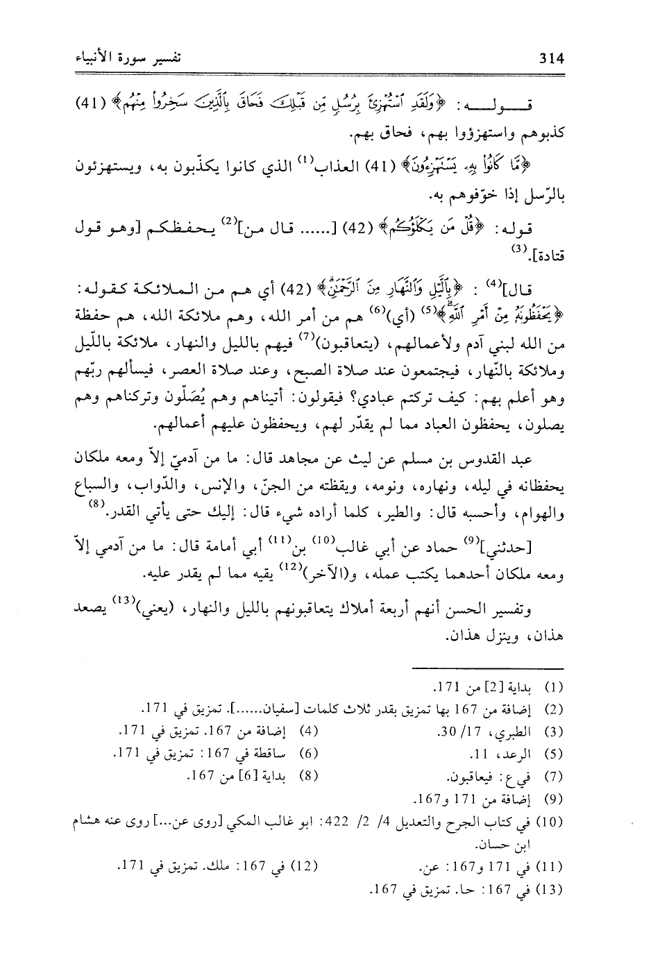 قَالَ: {بِاللَّيْلِ وَالنَّهَارِ مِنَ الرَّحْمَنِ} [الأنبياء: 42] أَيْ: هُمْ مِنَ الْمَلائِكَةِ كَقَوْلِهِ: {يَحْفَظُونَهُ مِنْ أَمْرِ اللَّهِ} [الرعد: 11] أَيْ: هُمْ مِنْ أَمْرِ اللَّهِ، وَهُمْ مَلائِكَةُ اللَّهِ، هُمْ حَفَظَةٌ مِنَ اللَّهِ لِبَنِي آدَمَ وَلأَعْمَالِهِمْ، يَتَعَاقَبُونَ فِيهِمْ بِاللَّيْلِ وَالنَّهَارِ، مَلائِكَةٌ بِاللَّيْلِ وَمَلائِكَةٌ بِالنَّهَارِ، فَيَجْتَمِعُونَ عِنْدَ صَلاةِ الصُّبْحِ، وَعِنْدَ صَلاةِ الْعَصْرِ، فَيَسْأَلُهُمْ رَبُّهُمْ وَهُوَ أَعْلَمُ بِهْم: كَيْفَ تَرَكْتُمْ عِبَادِي؟ فَيَقُولُونَ: أَتَيْنَاهُمْ