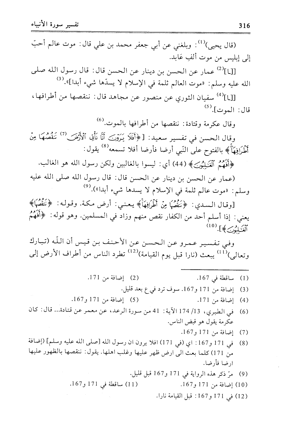 وَقَالَ الْحَسَنُ فِي تَفْسِيرِ سَعِيدٍ: {أَفَلا يَرَوْنَ أَنَّا نَأْتِي الأَرْضَ نَنْقُصُهَا مِنْ أَطْرَافِهَا} [الأنبياء: 44] بِالْفُتُوحِ عَلَى النَّبِيِّ أَرْضًا فَأَرْضًا أَفَلا تَسْمَعُهُ يَقُولُ: {أَفَهُمُ الْغَالِبُونَ} [الأنبياء: 44] أَيْ: لَيْسُوا بِالْغَالِبِينَ وَلَكِنَّ رَسُولَ اللَّهِ هُوَ الْغَالِبُ.