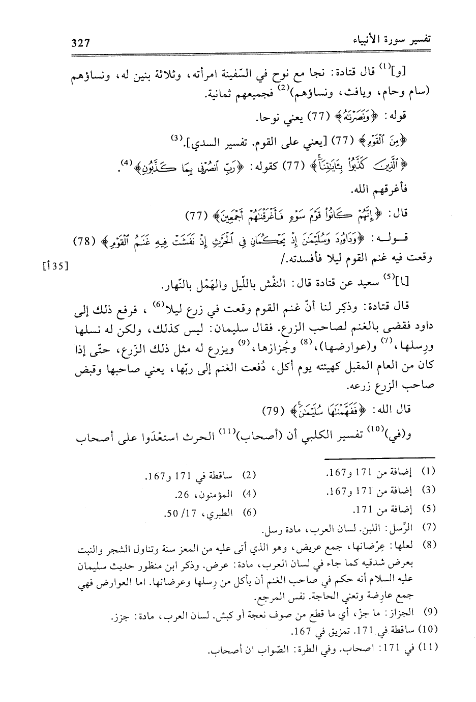قَالَ: {إِنَّهُمْ كَانُوا قَوْمَ سَوْءٍ فَأَغْرَقْنَاهُمْ أَجْمَعِينَ} [الأنبياء: 77] قَوْلُهُ: {وَدَاوُدَ وَسُلَيْمَانَ إِذْ يَحْكُمَانِ فِي الْحَرْثِ إِذْ نَفَشَتْ فِيهِ غَنَمُ الْقَوْمِ} [الأنبياء: 78] وَقَعَتْ فِيهِ غَنَمُ الْقَوْمِ لَيْلًا فَأَفْسَدَتْهُ.