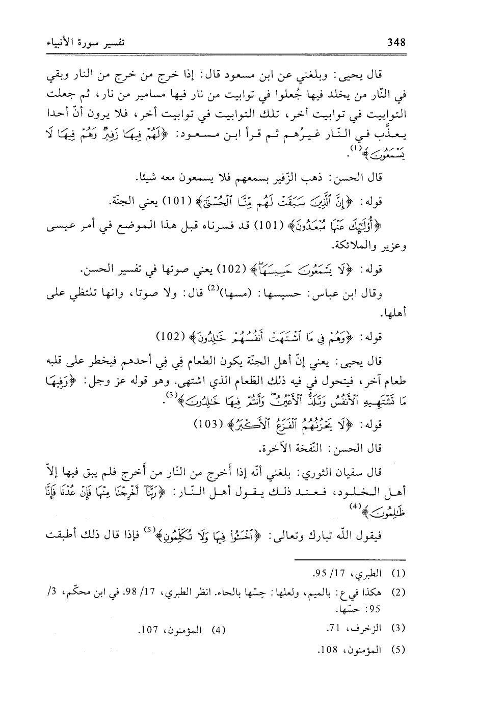- قَالَ يَحْيَى: وَبَلَغَنِي عَنِ ابْنِ مَسْعُودٍ قَالَ: إِذَا خَرَجَ مَنْ خَرَجَ مِنَ النَّارِ وَبَقِيَ فِي النَّارِ مَنْ يَخْلُدُ فِيهَا جُعِلُوا فِي تَوَابِيتَ مِنْ نَارٍ فِيهَا مَسَامِيرُ مِنْ نَارٍ، ثُمَّ جُعِلَتِ التَّوَابِيتُ فِي تَوَابِيتَ أُخَرَ، تِلْكَ التَّوَابِيتُ فِي تَوَابِيتَ أُخَرَ، فَلا يَرَوْنَ أَنَّ أَحَدًا يُعَذَّبُ فِي النَّارِ غَيْرَهُمْ ثُمَّ قَرَأَ ابْنُ مَسْعُودٍ: {لَهُمْ فِيهَا زَفِيرٌ وَهُمْ فِيهَا لا يَسْمَعُونَ} [الأنبياء: 100]