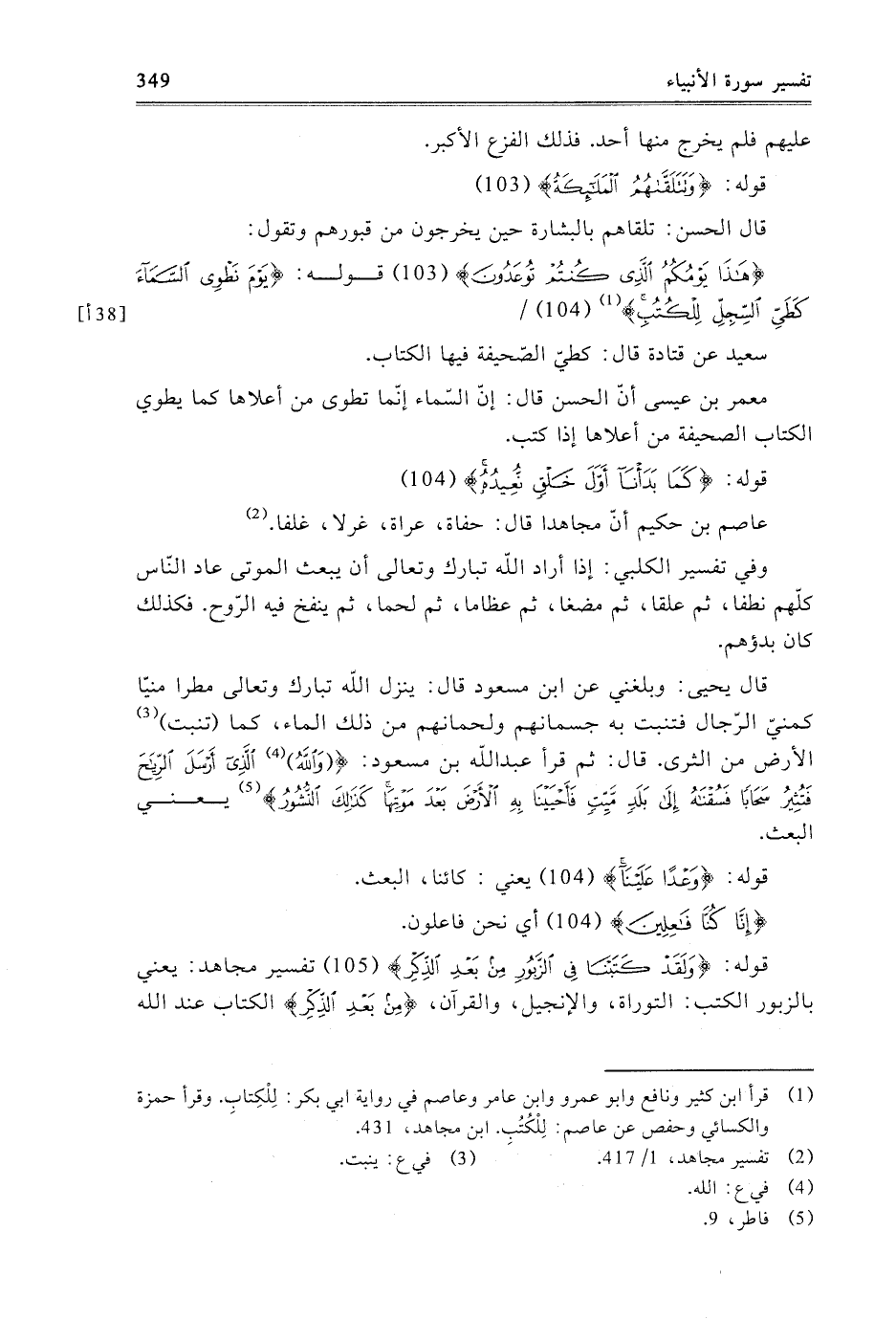 قَوْلُه: {وَتَتَلَقَّاهُمُ الْمَلائِكَةُ} [الأنبياء: 103] قَالَ الْحَسَنُ: تَلْقَاهُمْ بِالْبِشَارَةِ حِينَ يُخْرَجُونَ مِنْ قُبُورِهِمْ وَتَقُولُ: {هَذَا يَوْمُكُمُ الَّذِي كُنْتُمْ تُوعَدُونَ} [الأنبياء: 103] قَوْلُهُ: {يَوْمَ نَطْوِي السَّمَاءَ كَطَيِّ السِّجِلِّ لِلْكُتُبِ} [الأنبياء: 104] سَعِيدٌ، عَنْ قَتَادَةَ قَالَ: كَطَيِّ الصَّحِيفَةِ فِيهَا الْكِتَابُ.