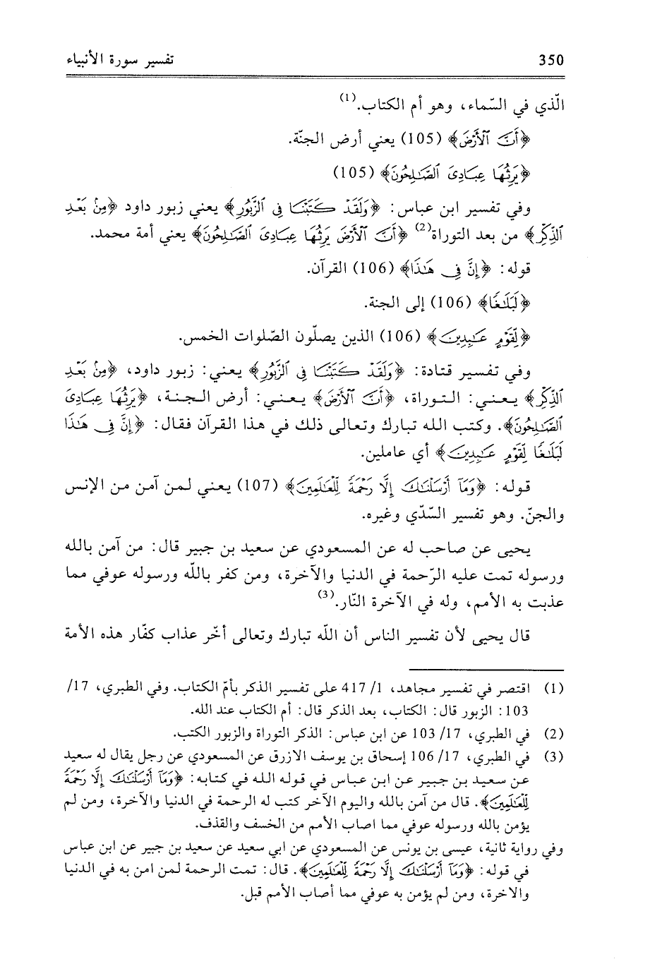 {يَرِثُهَا عِبَادِيَ الصَّالِحُونَ} [الأنبياء: 105] وَفِي تَفْسِيرِ ابْنِ عَبَّاسٍ: {وَلَقَدْ كَتَبْنَا فِي الزَّبُورِ} [الأنبياء: 105] يَعْنِي زَبُورَ دَاوُدَ {مِنْ بَعْدِ الذِّكْرِ} [الأنبياء: 105] مِنْ بَعْدِ التَّوْرَاةِ {أَنَّ الأَرْضَ يَرِثُهَا عِبَادِيَ الصَّالِحُونَ} [الأنبياء: 105] يَعْنِي أُمَّةَ مُحَمَّدٍ.