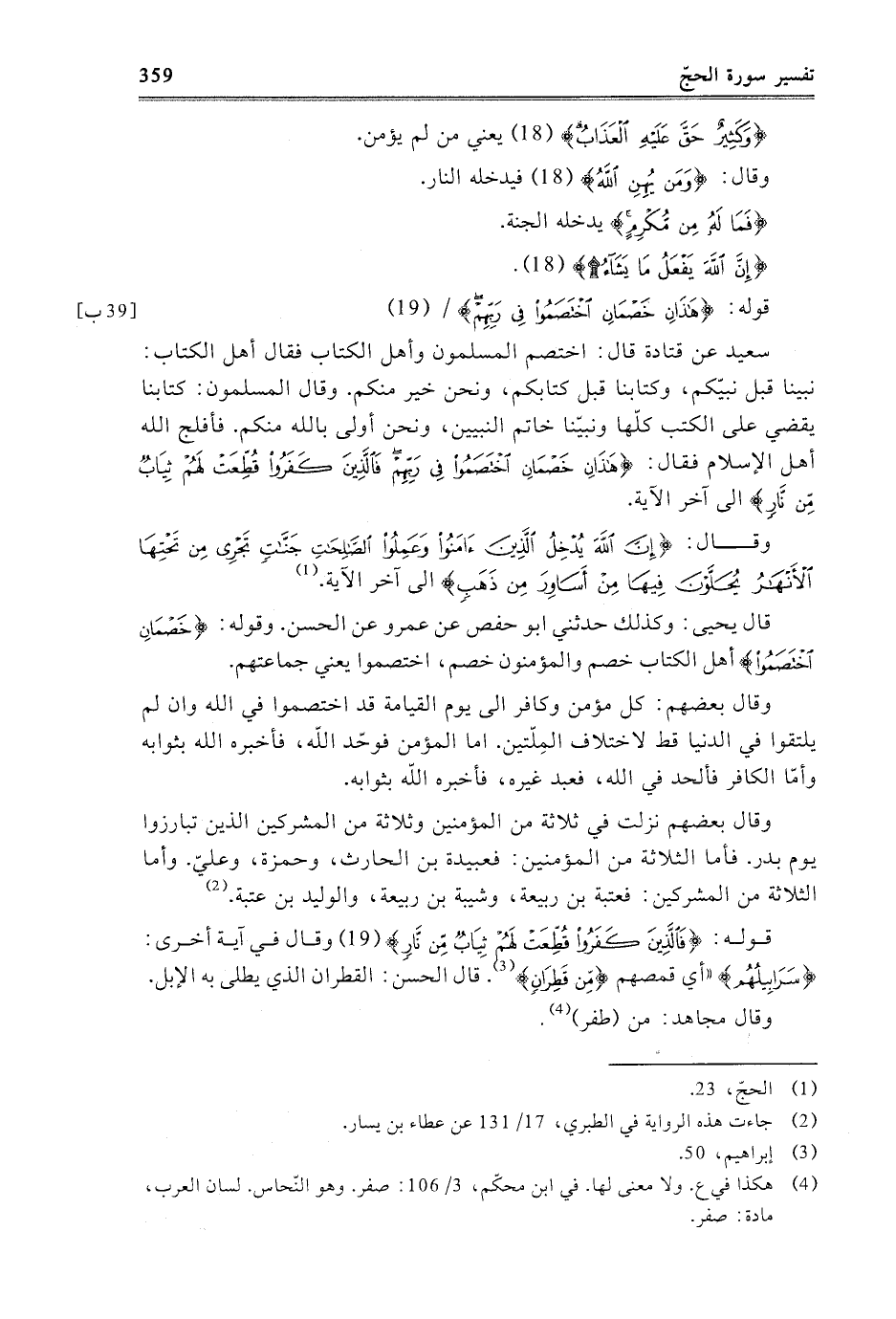 {إِنَّ اللَّهَ يَفْعَلُ مَا يَشَاءُ} [الحج: 18] قَوْلُهُ: {هَذَانِ خَصْمَانِ اخْتَصَمُوا فِي رَبِّهِمْ} [الحج: 19] سَعِيدٌ عَنْ قَتَادَةَ قَالَ: اخْتَصَمَ الْمُسْلِمُونَ وَأَهْلُ الْكِتَابِ فَقَالَ أَهْلُ الْكِتَابِ: نَبِيُّنَا قَبْلَ نَبِيِّكُمْ، وَكِتَابُنَا قَبْلَ كِتَابِكُمْ، وَنَحْنُ خَيْرٌ مِنْكُمْ.