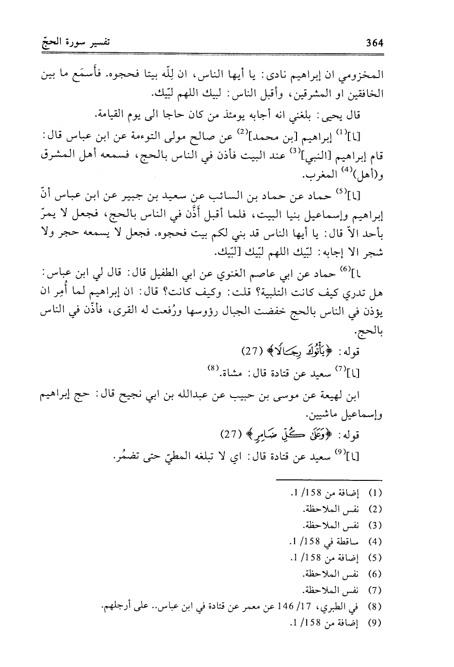 - نا إِبْرَاهِيمُ بْنُ مُحَمَّدٍ، عَنْ صَالِحٍ مَوْلَى التَّوْأَمَةِ، عَنِ ابْنِ عَبَّاسٍ قَالَ: قَامَ إِبْرَاهِيمُ النَّبِيُّ عِنْدَ الْبَيْتِ فَأَذَّنَ فِي النَّاسِ بِالْحَجِّ، فَسَمِعَهُ أَهْلُ الْمَشْرِقِ وَأَهْلُ الْمَغْرِبِ.