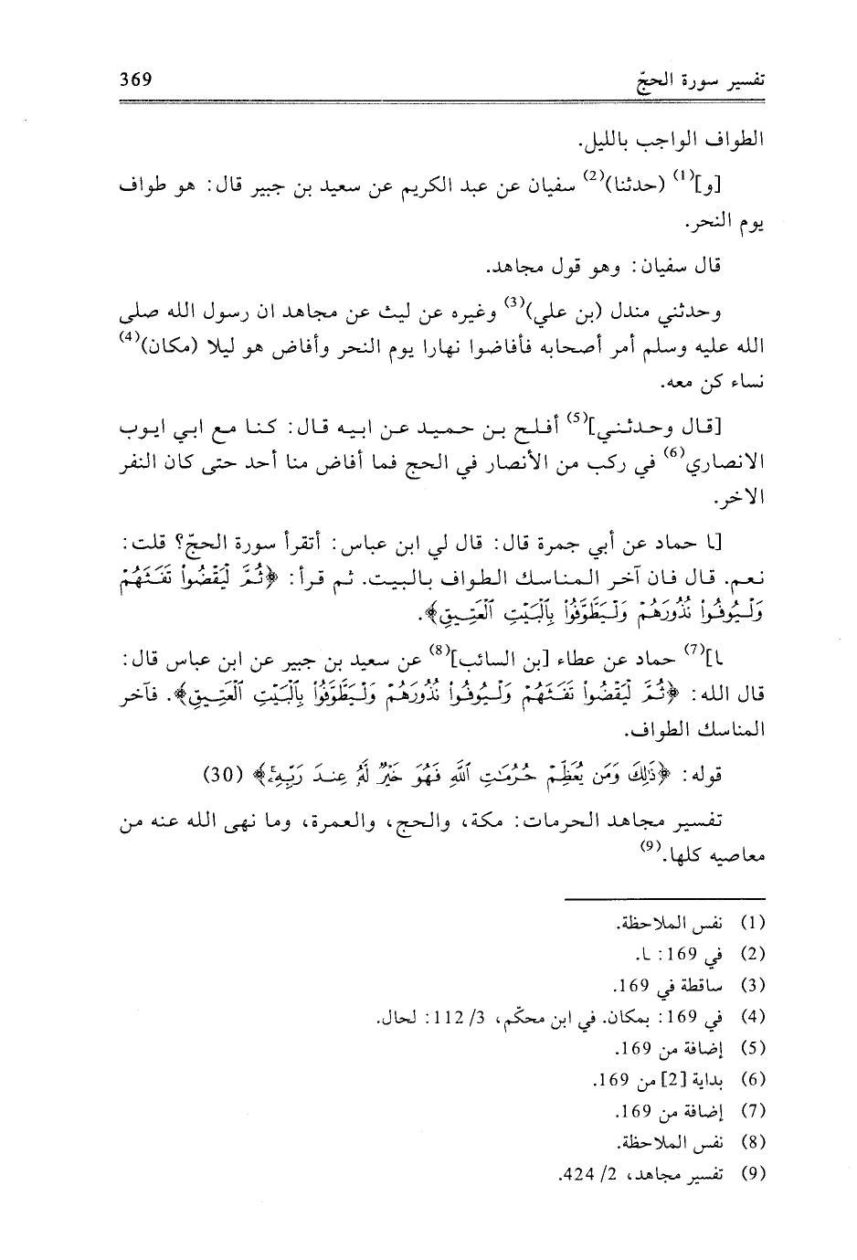 - نا حَمَّادٌ، عَنْ عَطَاءِ بْنِ السَّائِبِ، عَنْ سَعِيدِ بْنِ جُبَيْرٍ، عَنِ ابْنِ عَبَّاسٍ قَالَ: قَالَ اللَّهُ: {ثُمَّ لِيَقْضُوا تَفَثَهُمْ وَلْيُوفُوا نُذُورَهُمْ وَلْيَطَّوَّفُوا بِالْبَيْتِ الْعَتِيقِ} [الحج: 29] فَآخِرُ الْمَنَاسِكِ الطَّوَافُ.