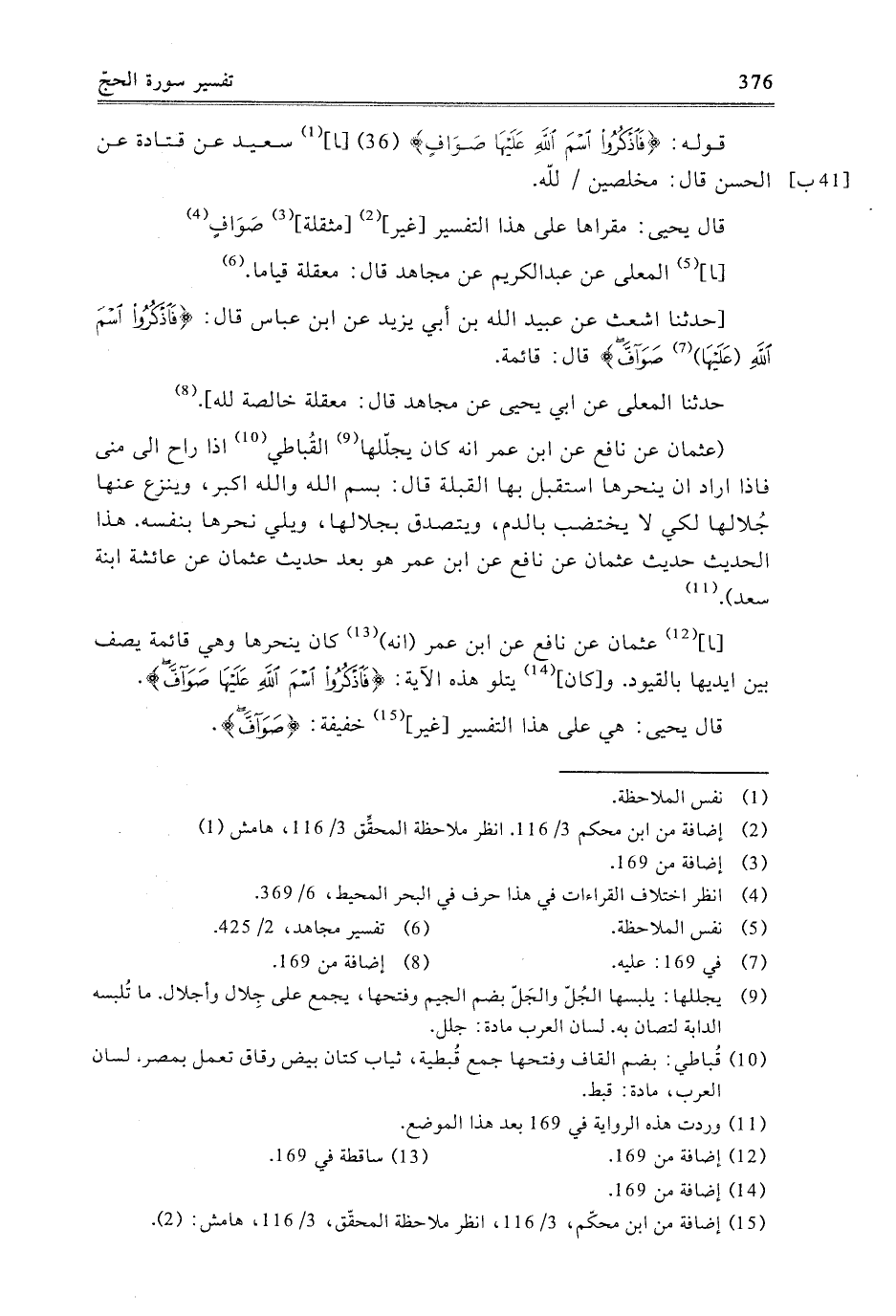 وَكَانَ يَتْلُو هَذِهِ الآيَةَ: {فَاذْكُرُوا اسْمَ اللَّهِ عَلَيْهَا صَوَافَّ} [الحج: 36] قَالَ يَحْيَى: هِيَ عَلَى هَذَا التَّفْسِيرِ غَيْرُ خَفِيفَةٍ: {صَوَافَّ} [الحج: 36]