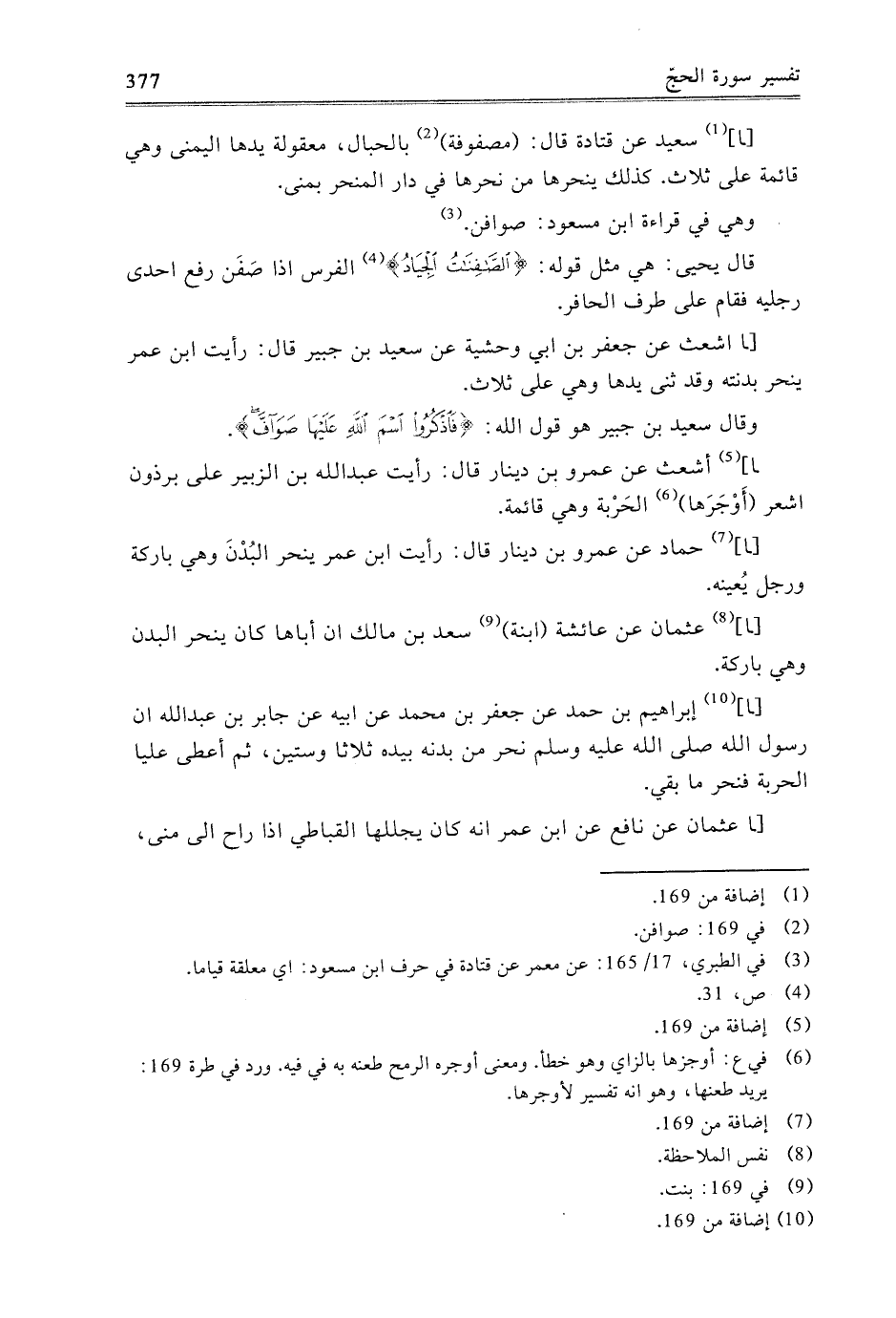 نا سَعِيدٌ عَنْ قَتَادَةَ قَالَ: مَصْفُوفَةٌ بِالْحِبَالِ، مَعْقُولَةٌ يَدُهَا الْيُمْنَى وَهِيَ قَائِمَةٌ عَلَى ثَلاثٍ.