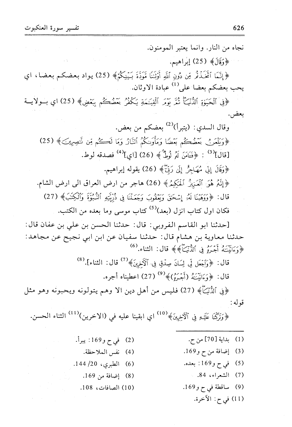 حَدَّثَنَا أَبُو الْقَاسِمِ الْفروبيُّ: قَالَ: حَدَّثَنَا الْحَسَنُ بْنُ عَلِيِّ بْنِ عَفَّانَ، قَالَ: حَدَّثَنَا مُعَاوِيَةُ بْنُ هِشَامٍ، قَالَ: حَدَّثَنَا سُفْيَانُ، عَنِ ابْنِ أَبِي نَجِيحٍ، عَنْ مُجَاهِدٍ: {وَآتَيْنَاهُ أَجْرَهُ فِي الدُّنْيَا} [العنكبوت: 27] قَالَ: الثَّنَاءَ.