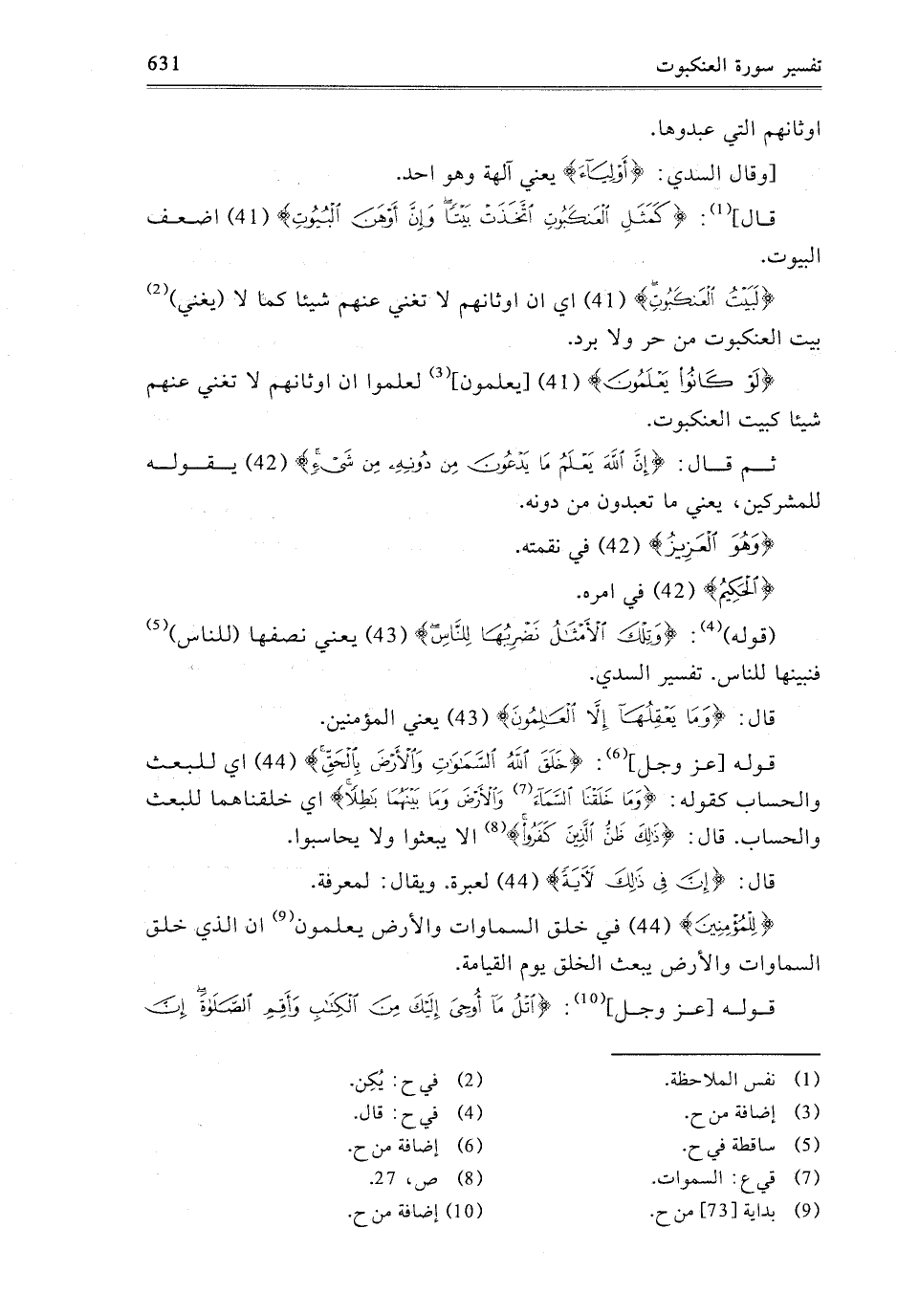 قَوْلُهُ: {وَتِلْكَ الأَمْثَالُ نَضْرِبُهَا لِلنَّاسِ} [العنكبوت: 43] ، يَعْنِي: نَصِفُهَا لِلنَّاسِ، فَنُبَيِّنُهَا لِلنَّاسِ، تَفْسِيرُ السُّدِّيِّ.