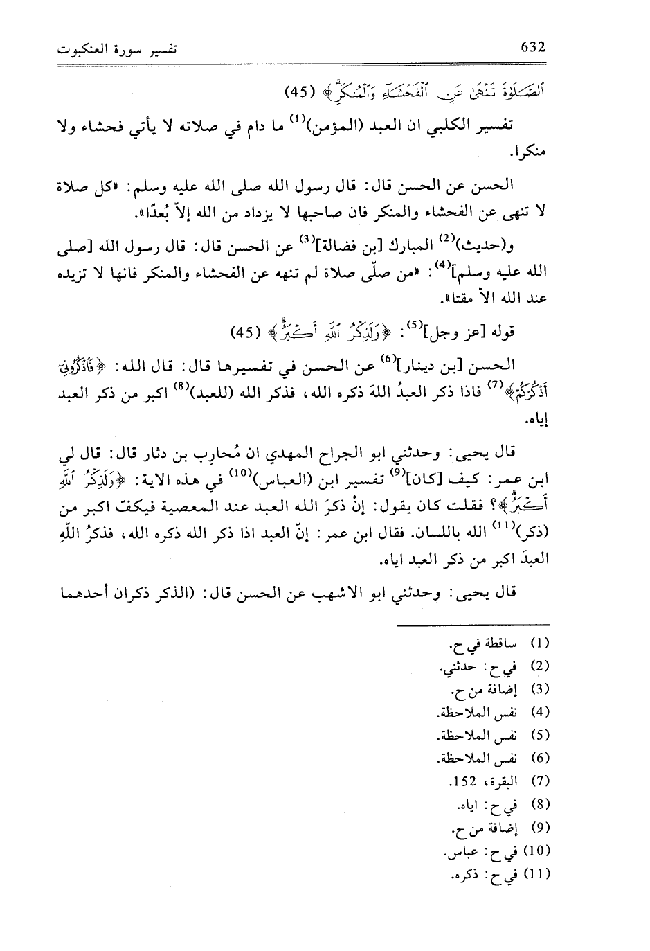 - قَالَ يَحْيَى: وَحَدَّثَنِي أَبُو الْجَرَّاحِ الْمَهْدِيُّ أَنَّ مُحَارِبَ بْنَ دِثَارٍ قَالَ: قَالَ لِي ابْنُ عُمَرَ: كَيْفَ كَانَ تَفْسِيرُ ابْنِ الْعَبَّاسِ فِي هَذِهِ الآيَةِ {وَلَذِكْرُ اللَّهِ أَكْبَرُ} [العنكبوت: 45] ؟ فَقُلْتُ: كَانَ يَقُولُ: إِنَّ ذِكْرَ اللَّهِ الْعَبْدُ عِنْدَ الْمَعْصِيَةِ، فَكَيْفَ أَكْبَرُ مِنْ ذِكْرِ اللَّهِ بِاللِّسَانِ، فَقَالَ ابْنُ عُمَرَ: إِنَّ الْعَبْدَ إِذَا ذَكَرَ اللَّهَ ذَكَرَهُ اللَّهُ، فَذِكْرُ اللَّهِ الْعَبْدَ أَكْبَرُ مِنْ ذِكْرِ الْعَبْدِ إِيَّاهُ.