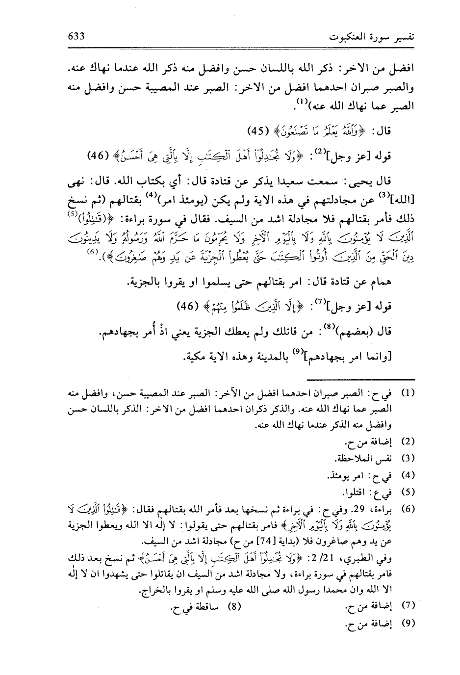 قَالَ: {وَاللَّهُ يَعْلَمُ مَا تَصْنَعُونَ} [العنكبوت: 45] قَوْلُهُ عَزَّ وَجَلَّ: {وَلا تُجَادِلُوا أَهْلَ الْكِتَابِ إِلا بِالَّتِي هِيَ أَحْسَنُ} [العنكبوت: 46] قَالَ يَحْيَى: سَمِعْتُ سَعِيدًا يَذْكُرُ عَنْ قَتَادَةَ، قَالَ: أَيْ: بِكِتَابِ اللَّهِ، قَالَ: نَهَى اللَّهُ عَنْ مُجَادَلَتِهِمْ فِي هَذِهِ الآيَةِ وَلَمْ يَكُنْ يَوْمَئِذٍ أَمَرَ بِقِتَالِهِمْ ثُمَّ نَسَخَ ذَلِكَ فَأَمَرَ بِقِتَالِهِمْ فَلا مُجَادَلَةَ أَشَدُّ مِنَ السَّيْفِ، فَقَالَ فِي سُورَةِ بَرَاءَةٍ: {قَاتِلُوا الَّذِينَ لا يُؤْمِنُونَ بِاللَّهِ وَلا بِالْيَوْمِ الآخِرِ