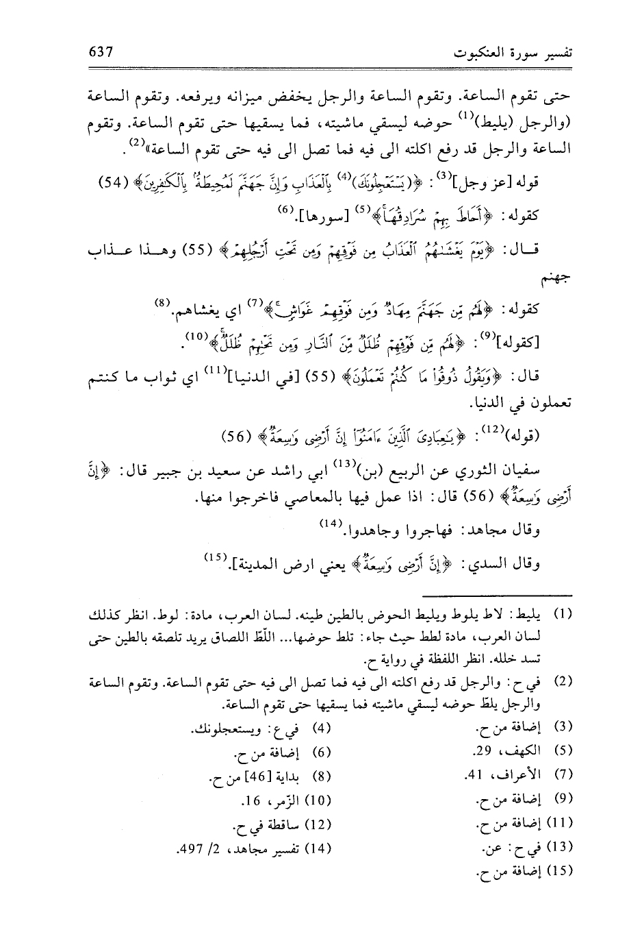 قَوْلُهُ عَزَّ وَجَلَّ: {يَسْتَعْجِلُونَكَ بِالْعَذَابِ وَإِنَّ جَهَنَّمَ لَمُحِيطَةٌ بِالْكَافِرِينَ} [العنكبوت: 54] كَقَوْلِهِ: {أَحَاطَ بِهِمْ سُرَادِقُهَا} [الكهف: 29] سُورُهَا.