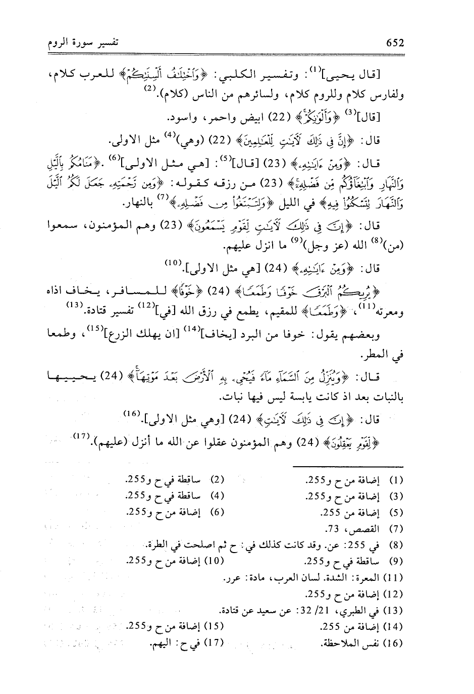 قَالَ يَحْيَى: وَتَفْسِيرُ الْكَلْبِيِّ: {وَاخْتِلافُ أَلْسِنَتِكُمْ} [الروم: 22] لِلْعَرَبِ كَلامٌ، وَلِفَارِسَ كَلامٌ وَلِلرُّومِ كَلامٌ، وَلِسَائِرِهِمْ مِنَ النَّاسِ كَلامٌ.