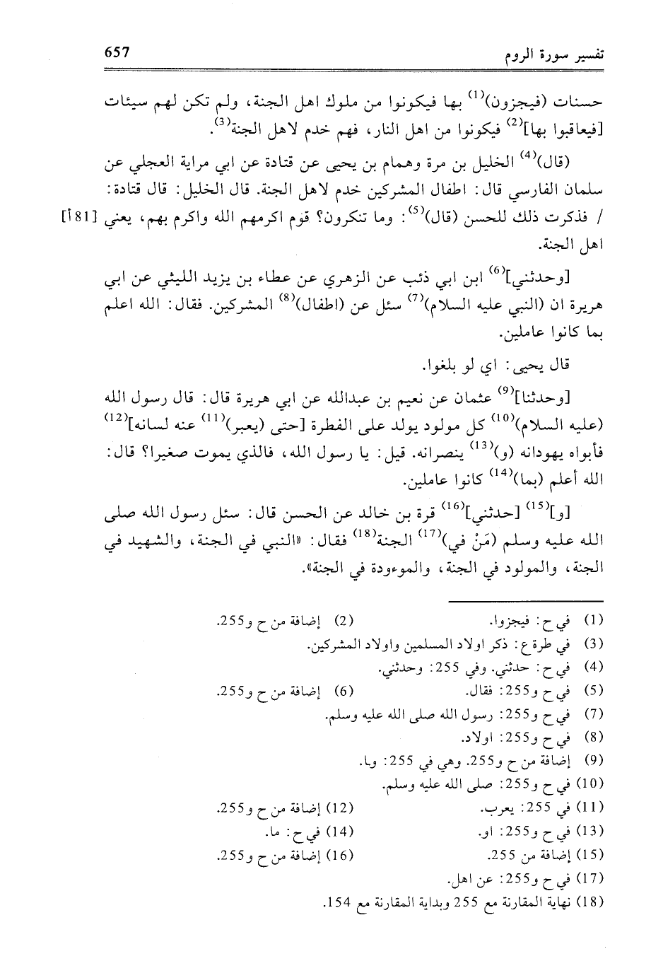 - قَالَ الْخَلِيلُ بْنُ مُرَّةَ، وَهَمَّامُ بْنُ يَحْيَى، عَنْ قَتَادَةَ، عَنْ أَبِي مرَايَةَ الْعِجْلِيِّ، عَنْ سَلْمَانَ الْفَارِسِيِّ، قَالَ: أَطْفَالُ الْمُشْرِكِينَ خَدَمٌ لأَهْلِ الْجَنَّةِ