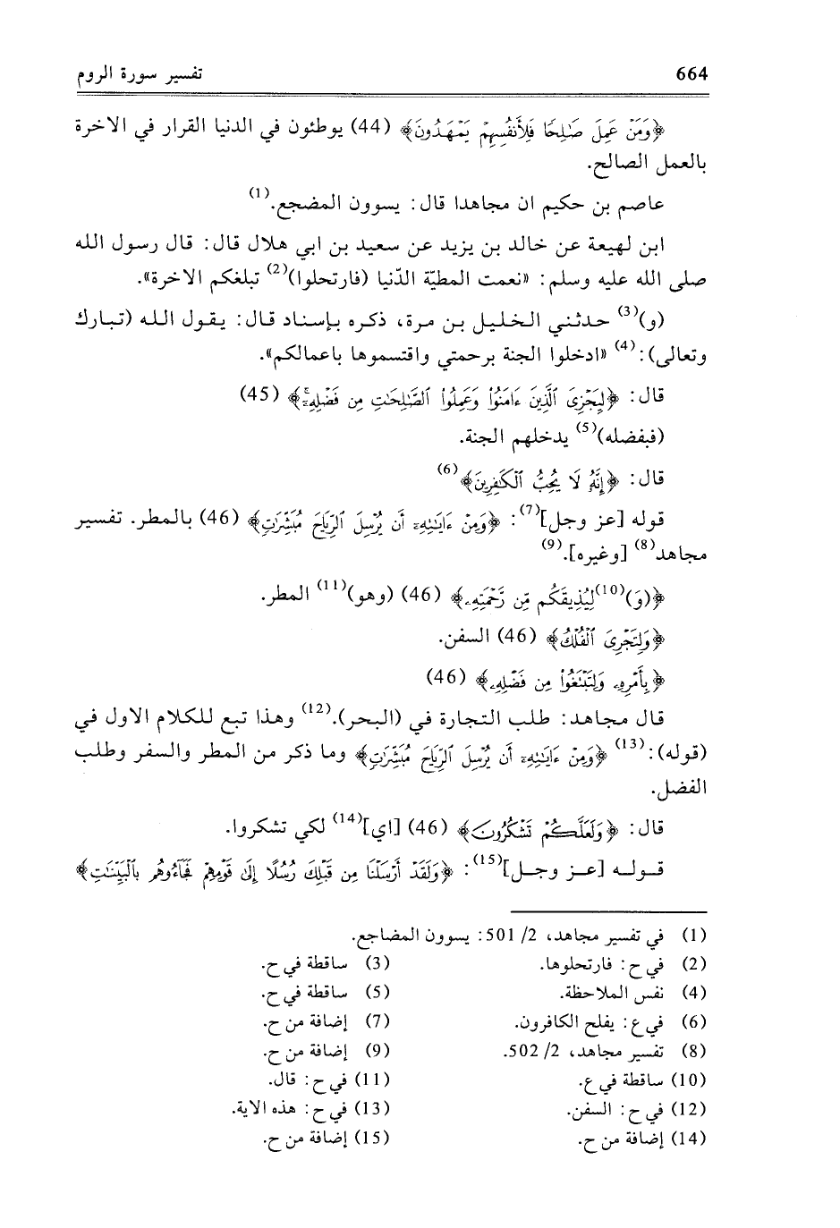 {بِأَمْرِهِ وَلِتَبْتَغُوا مِنْ فَضْلِهِ} [الروم: 46] قَالَ مُجَاهِدٌ: طَلَبُ التِّجَارَةِ فِي الْبَحْرِ، وَهَذَا تَبَعٌ لِلْكَلامِ الأَوَّلِ فِي قَوْلِهِ: {وَمِنْ آيَاتِهِ أَنْ يُرْسِلَ الرِّيَاحَ مُبَشِّرَاتٍ} [الروم: 46] وَمَا ذُكِرَ مِنَ الْمَطَرِ وَالسَّفَرِ وَطَلَبِ الْفَضْلِ.