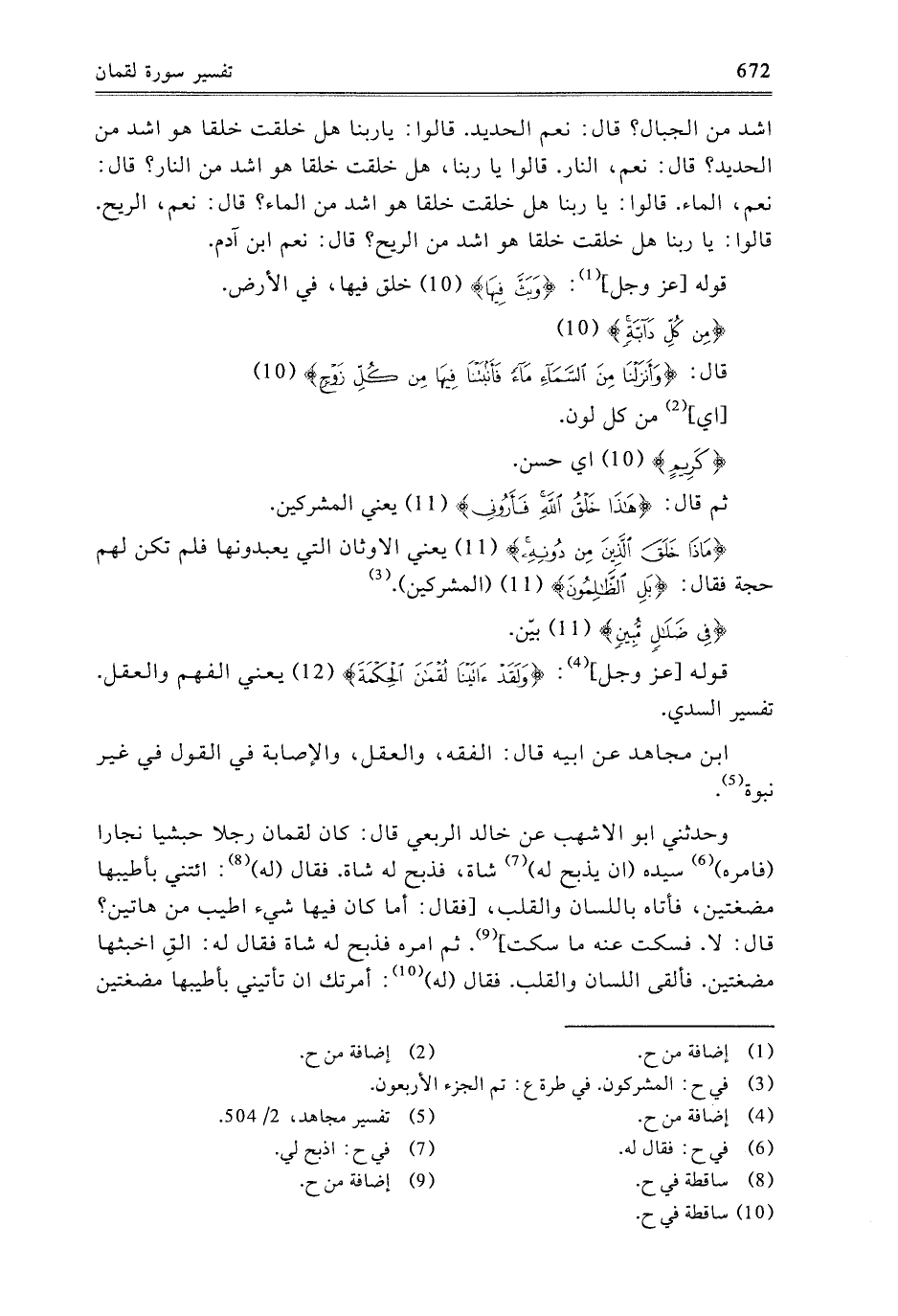 وَحَدَّثَنِي أَبُو الأَشْهَبِ، عَنْ خَالِدٍ الرَّبَعِيِّ قَالَ: كَانَ لُقْمَانُ رَجُلا حَبَشِيًّا نَجَّارًا، فَأَمَرَهُ سَيِّدُهُ أَنْ يَذْبَحَ لَهُ شَاةً، فَذَبَحَ لَهُ شَاةً، فَقَالَ لَهُ: ائْتِنِي بِأَطْيَبِهَا مُضْغَتَيْنِ، فَأَتَاهُ بِاللِّسَانِ وَالْقَلْبِ، فَقَالَ: أَمَا كَانَ فِيهَا شَيْءٌ أَطْيَبَ مِنْ هَاتَيْنِ؟ قَالَ: لا، فَسَكَتَ عَنْهُ مَا سَكَتَ، ثُمَّ أَمَرَهُ فَذَبَحَ لَهُ شَاةً، فَقَالَ لَهُ: أَلْقِ أَخْبَثَهَا مُضْغَتَيْنِ، فَأَلْقَى اللِّسَانَ وَالْقَلْبَ، فَقَالَ لَهُ: أَمَرْتُكَ أَنْ تَأْتِيَنِي بِأَطْيَبِهَا مُضْغَتَيْنِ،