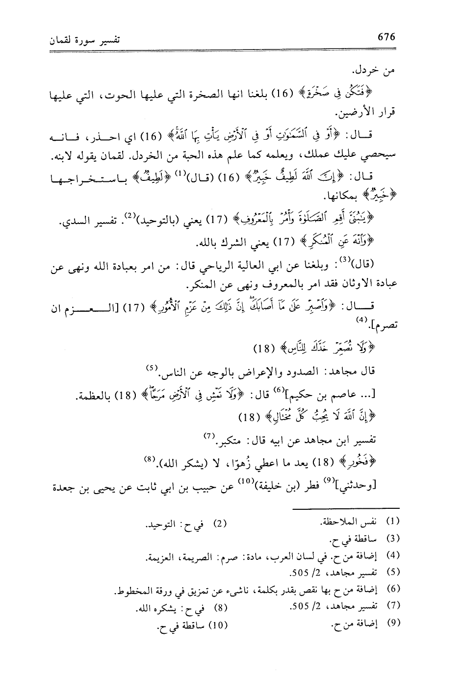قَالَ: {أَوْ فِي السَّمَوَاتِ أَوْ فِي الأَرْضِ يَأْتِ بِهَا اللَّهُ} [لقمان: 16] ، أَيِ: احْذَرْ، فَإِنَّهُ سَيُحْصِي عَلَيْكَ عَمَلَكَ، وَيَعْلَمُهُ كَمَا عَلِمَ هَذِهِ الْحَبَّةَ مِنَ الْخَرْدَلِ، لُقْمَانُ يَقُولُهُ لابْنِهِ.