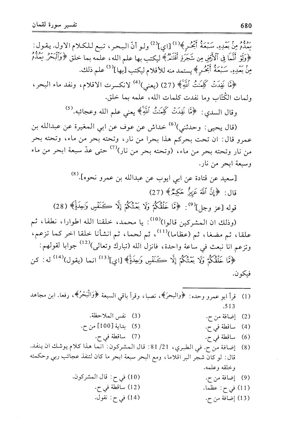 يَمُدُّهُ مِنْ بَعْدِهِ سَبْعَةُ أَبْحُرٍ، أَيْ: وَلَوْ أَنَّ الْبَحْرَ، تَبَعٌ لِلْكَلامِ الأَوَّلِ يَقُولُ: {وَلَوْ أَنَّمَا فِي الأَرْضِ مِنْ شَجَرَةٍ أَقْلامٌ} [لقمان: 27] لِيُكْتَبَ بِهَا عِلْمُ اللَّهِ، عِلْمُهُ بِمَا خَلَقَ {وَالْبَحْرُ يَمُدُّهُ مِنْ بَعْدِهِ سَبْعَةُ أَبْحُرٍ} [لقمان: 27] يَسْتَمِدُّ مِنْهُ الأَقْلامَ لِيَكْتُبَ بِهَا عِلْمَ ذَلِكَ.