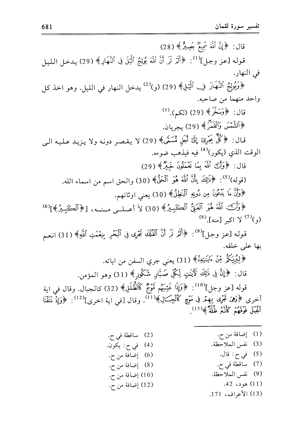 قَالَ: {إِنَّ اللَّهَ سَمِيعٌ بَصِيرٌ} [لقمان: 28] قَوْلُهُ عَزَّ وَجَلَّ: {أَلَمْ تَرَ أَنَّ اللَّهَ يُولِجُ اللَّيْلَ فِي النَّهَارِ} [لقمان: 29] يُدْخِلُ اللَّيْلَ فِي النَّهَارِ.