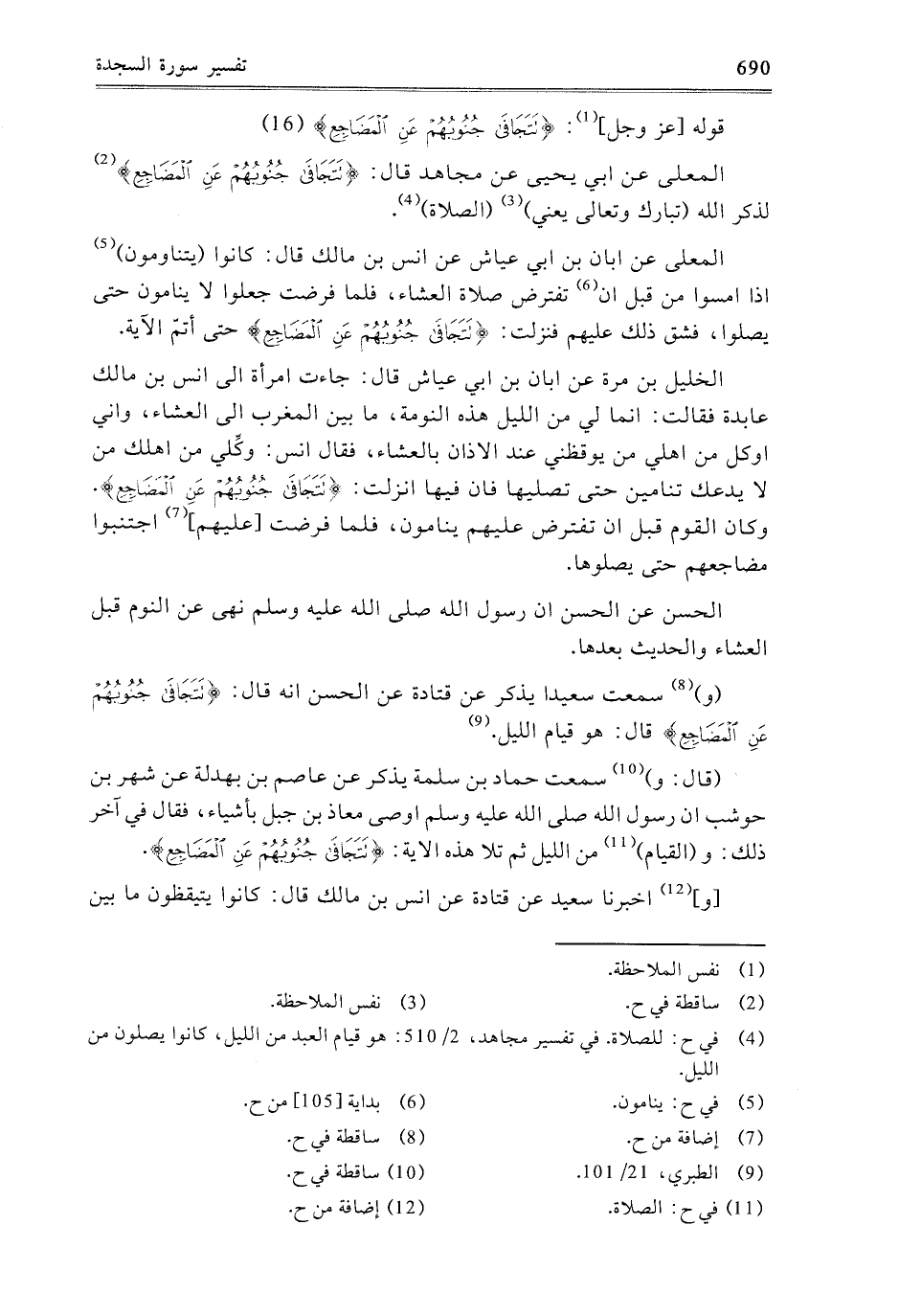 - قَالَ: وَسَمِعْتُ حَمَّادَ بْنَ سَلَمَةَ يَذْكُرُ عَنْ عَاصِمِ بْنِ بَهْدَلَةَ، عَنْ شَهْرِ بْنِ حَوْشَبٍ، أَنَّ رَسُولَ اللَّهِ صَلَّى اللَّهُ عَلَيْهِ وَسَلَّمَ أَوْصَى مُعَاذَ بْنَ جَبَلٍ بِأَشْيَاءَ، فَقَالَ فِي آخِرِ ذَلِكَ: وَالْقِيَامُ مِنَ اللَّيْلِ ثُمَّ تَلا هَذِهِ الآيَةَ: {تَتَجَافَى جُنُوبُهُمْ عَنِ الْمَضَاجِعِ} [السجدة: 16] .