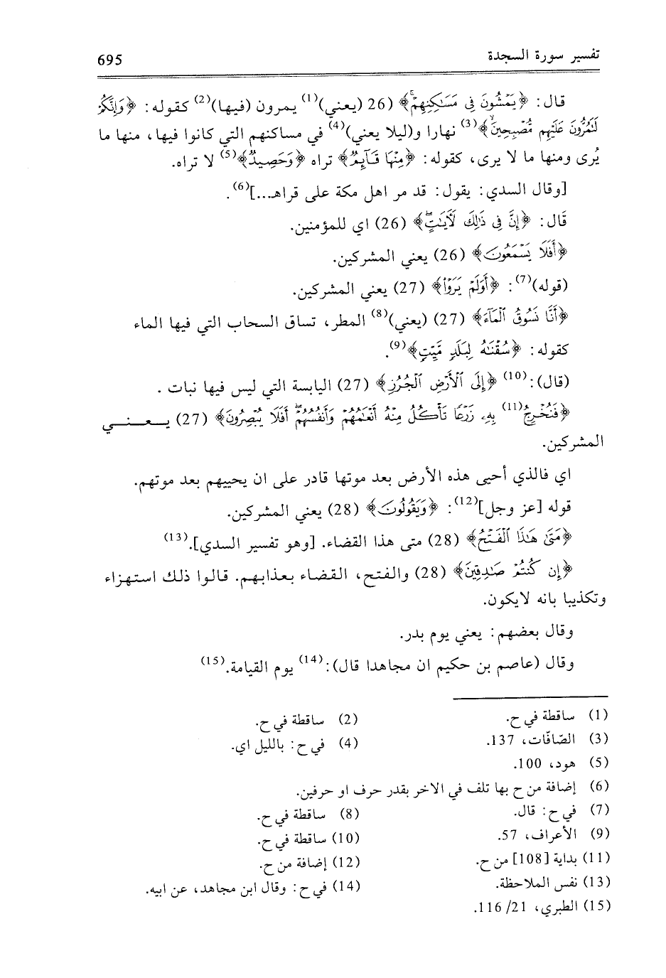 قَالَ: {يَمْشُونَ فِي مَسَاكِنِهِمْ} [السجدة: 26] ، يَعْنِي: يَمُرُّونَ فِيهَا كَقَوْلِهِ: {وَإِنَّكُمْ لَتَمُرُّونَ عَلَيْهِمْ مُصْبِحِينَ} [الصافات: 137] نَهَارًا وَلَيْلا، يَعْنِي: فِي مَسَاكِنِهِمُ الَّتِي كَانُوا فِيهَا، مِنْهَا مَا يُرَى وَمِنْهَا مَا لا يُرَى، كَقَوْلِهِ: {مِنْهَا قَائِمٌ} [هود: 100] تَرَاهُ {وَحَصِيدٌ} [هود: 100] لا تَرَاهُ.