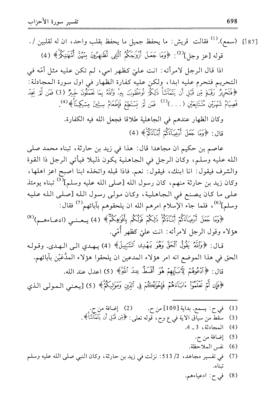 يَصْنَعُ فِي الْجَاهِلِيَّةِ، وَكَانَ مَوْلَى رَسُولِ اللَّهِ صَلَّى اللَّهُ عَلَيْهِ وَسَلَّمَ، فَلَمَّا جَاءَ الإِسْلامُ أَمَرَهُمُ اللَّهُ أَنْ يُلْحِقُوهُمْ بِآبَائِهِمْ فَقَالَ: {وَمَا جَعَلَ أَدْعِيَاءَكُمْ أَبْنَاءَكُمْ ذَلِكُمْ قَوْلُكُمْ بِأَفْوَاهِكُمْ} [الأحزاب: 4] ، يَعْنِي: ادِّعَاءَهُمْ هَؤُلاءِ وَقَوْلَ الرَّجُلِ لامْرَأَتِهِ: أَنْتِ عَلَيَّ كَظَهْرِ أُمِّي.