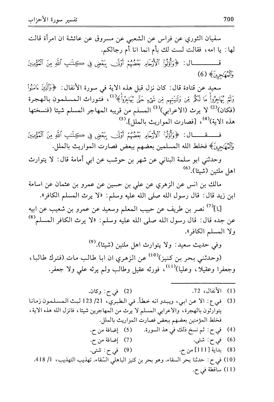 قَالَ: {وَأُولُو الأَرْحَامِ بَعْضُهُمْ أَوْلَى بِبَعْضٍ فِي كِتَابِ اللَّهِ مِنَ الْمُؤْمِنِينَ وَالْمُهَاجِرِينَ} [الأحزاب: 6] سَعِيدٌ، عَنْ قَتَادَةَ، قَالَ: كَانَ نَزَلَ قَبْلَ هَذِهِ الآيَةِ فِي { [الأنفال:] وَالَّذِينَ آمَنُوا وَلَمْ يُهَاجِرُوا مَا لَكُمْ مِنْ وَلايَتِهِمْ مِنْ شَيْءٍ حَتَّى يُهَاجِرُوا} [سورة الأنفال: 72] ، فَتَوَارَثَ الْمُسْلِمُونَ بِالْهِجْرَةِ، فَكَانَ لا يَرِثُ الأَعْرَابِيُّ الْمُسْلِمَ مِنْ قَرِيبِهِ الْمُهَاجِرِ الْمُسْلِمِ شَيْئًا، فَنَسَخَتْهَا هَذِهِ الآيَةُ، فَصَارَتِ الْمَوَارِيثُ بِالْمِلَلِ.