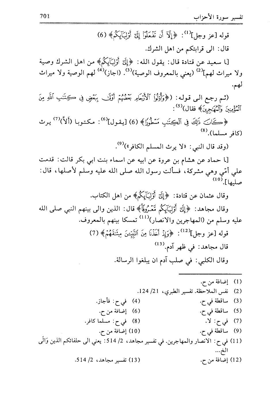 ثُمَّ رَجَعَ إِلَى قَوْلِهِ: {وَأُولُو الأَرْحَامِ بَعْضُهُمْ أَوْلَى بِبَعْضٍ فِي كِتَابِ اللَّهِ مِنَ الْمُؤْمِنِينَ وَالْمُهَاجِرِينَ} [الأحزاب: 6] فَقَالَ: {كَانَ ذَلِكَ فِي الْكِتَابِ مَسْطُورًا} [الأحزاب: 6] يَقُولُ: مَكْتُوبًا أَلا يَرِثَ كَافِرٌ مُسْلِمًا.