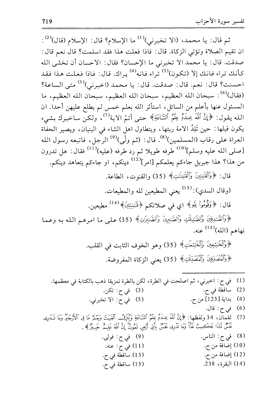 ثُمَّ قَالَ: يَا مُحَمَّدُ أَلا تُخْبِرُنِي مَا الإِسْلامُ؟ قَالَ: «الإِسْلامُ أَنْ تُقِيمَ الصَّلاةَ وَتُؤْتِي الزَّكَاةَ» ، قَالَ: فَإِذَا فَعَلْتُ هَذَا فَقَدْ أَسْلَمْتُ؟ قَالَ: «نَعَمْ» ، قَالَ: صَدَقْتَ، قَالَ: يَا مُحَمَّدُ أَلا تُخْبِرُنِي مَا الإِحْسَانُ؟ فَقَالَ: «الإِحْسَانُ أَنْ تَخْشَى اللَّهَ كَأَنَّكَ تَرَاهُ، فَإِنَّكَ إِلا تَكُونُ تَرَاهُ فَإِنَّهُ يَرَاكَ» ، قَالَ: فَإِذَا فَعَلْتُ هَذَا فَقَدْ أَحْسَنْتُ؟ قَالَ: «نَعَمْ» ، قَالَ: صَدَقْتَ، قَالَ: يَا مُحَمَّدُ أَخْبِرْنِي مَتَى السَّاعَةُ؟ فَقَالَ: " سُبْحَانَ اللَّهِ