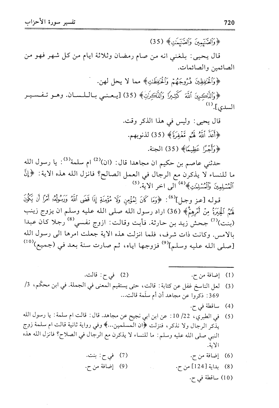 - حَدَّثَنِي عَاصِمُ بْنُ حَكِيمٍ أَنَّ مُجَاهِدًا، قَالَ: إِنَّ أُمَّ سَلَمَةَ قَالَتْ: يَا رَسُولَ اللَّهِ مَا لِلنِّسَاءِ لا يُذْكَرْنَ مَعَ الرِّجَالِ فِي الْعَمَلِ الصَّالِحِ؟ فَأَنْزَلَ اللَّهُ هَذِهِ الآيَةَ: {إِنَّ الْمُسْلِمِينَ وَالْمُسْلِمَاتِ} [الأحزاب: 35] إِلَى آخِرِ الآيَةِ.