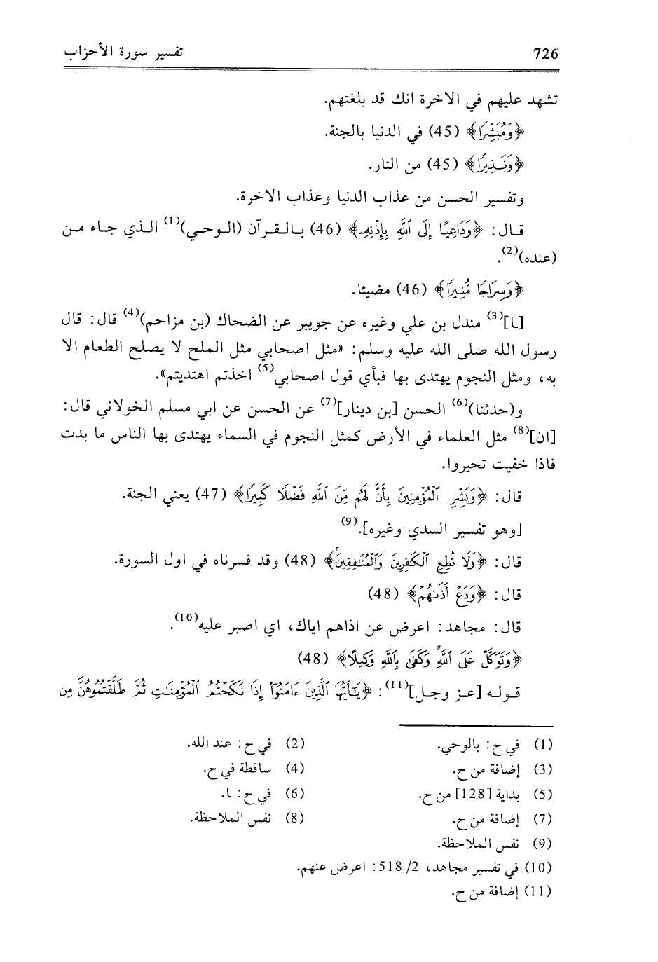 قَالَ: {وَدَعْ أَذَاهُمْ} [الأحزاب: 48] قَالَ مُجَاهِدٌ: اعْرِضْ عَنْ أَذَاهُمْ إِيَّاكَ، أَيِ: اصْبِرْ عَلَيْهِ.