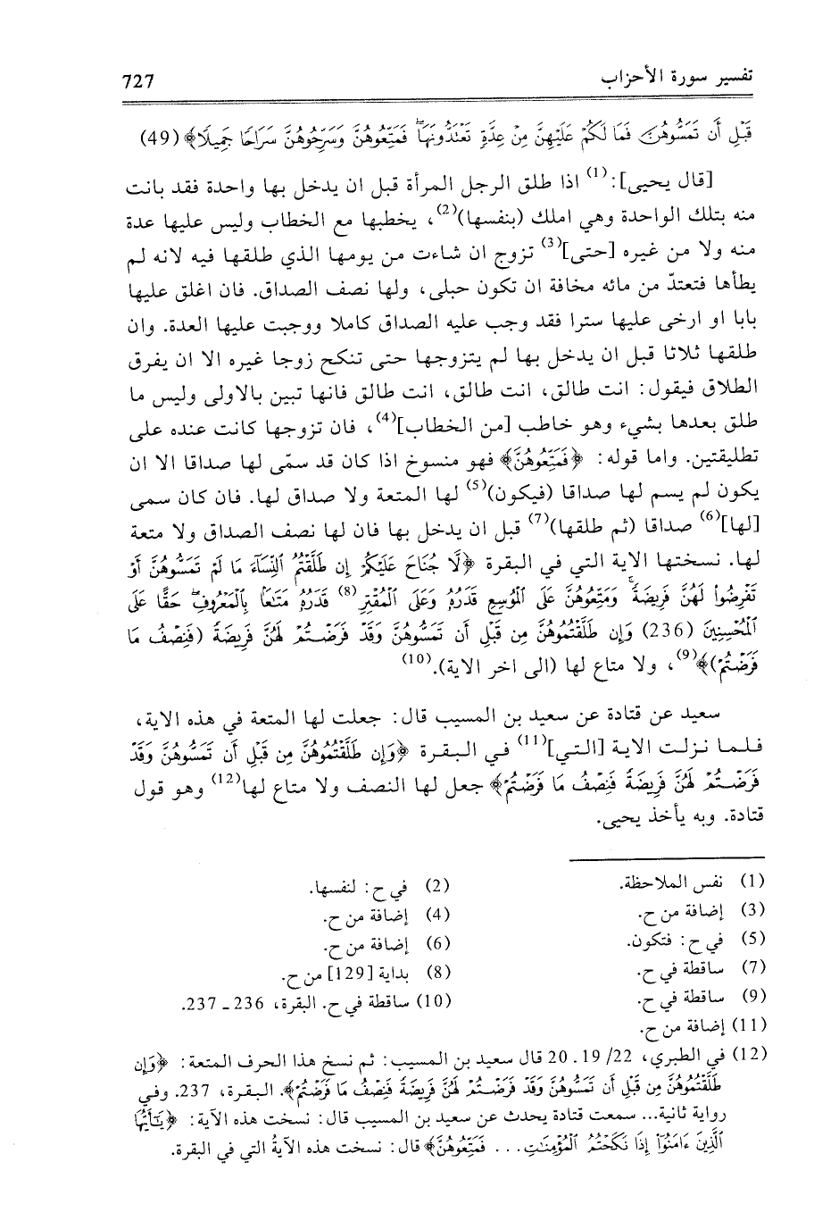 سَعِيدٌ، عَنْ قَتَادَةَ، عَنْ سَعِيدِ بْنِ الْمُسَيِّبِ، قَالَ: جُعِلَتْ لَهَا الْمُتْعَةُ فِي هَذِهِ الآيَةِ، فَلَمَّا نَزَلَتِ الآيَةُ الَّتِي فِي الْبَقَرَةِ: {وَإِنْ طَلَّقْتُمُوهُنَّ مِنْ قَبْلِ أَنْ تَمَسُّوهُنَّ وَقَدْ فَرَضْتُمْ لَهُنَّ فَرِيضَةً فَنِصْفُ مَا فَرَضْتُمْ} [البقرة: 237] جُعِلَ لَهَا النِّصْفُ وَلا مَتَاعَ لَهَا وَهُوَ قَوْلُ قَتَادَةَ، وَبِهِ يَأْخُذُ يَحْيَى.