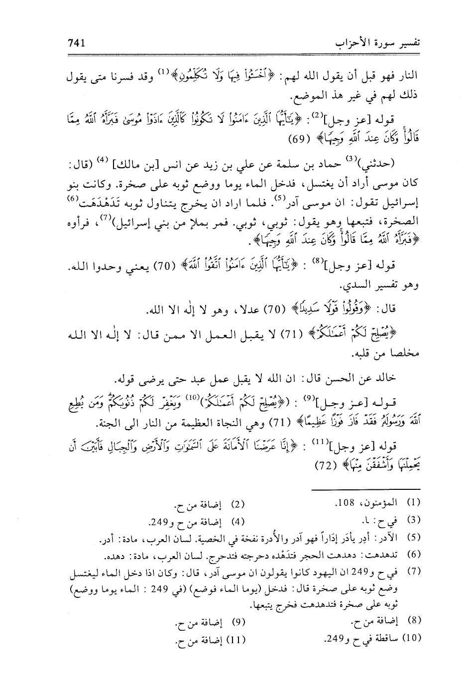 - حَدَّثَنِي حَمَّادُ بْنُ سَلَمَةَ، عَنْ عَلِيِّ بْنِ زَيْدٍ، عَنْ أَنَسِ بْنِ مَالِكٍ، قَالَ: كَانَ مُوسَى أَرَادَ أَنْ يَغْتَسِلَ، فَدَخَلَ الْمَاءَ يَوْمًا وَوَضَعَ ثَوْبَهُ عَلَى صَخْرَةٍ، وَكَانَتْ بَنُو إِسْرَائِيلَ تَقُولُ: إِنَّ مُوسَى آدَرُ، فَلَمَّا أَرَادَ أَنْ يَخْرُجَ يَتَنَاوَلَ ثَوْبَهُ تَدَهْدَهَتِ الصَّخْرَةُ، فَتَبِعَهَا وَهُوَ يَقُولُ: ثُوبِي، ثُوبِي، فَمَرَّ بِمَلإٍ مِنْ بَنِي إِسْرَائِيلَ، فَرَأَوْهُ {فَبَرَّأَهُ اللَّهُ مِمَّا قَالُوا وَكَانَ عِنْدَ اللَّهِ وَجِيهًا} [الأحزاب: 69] .