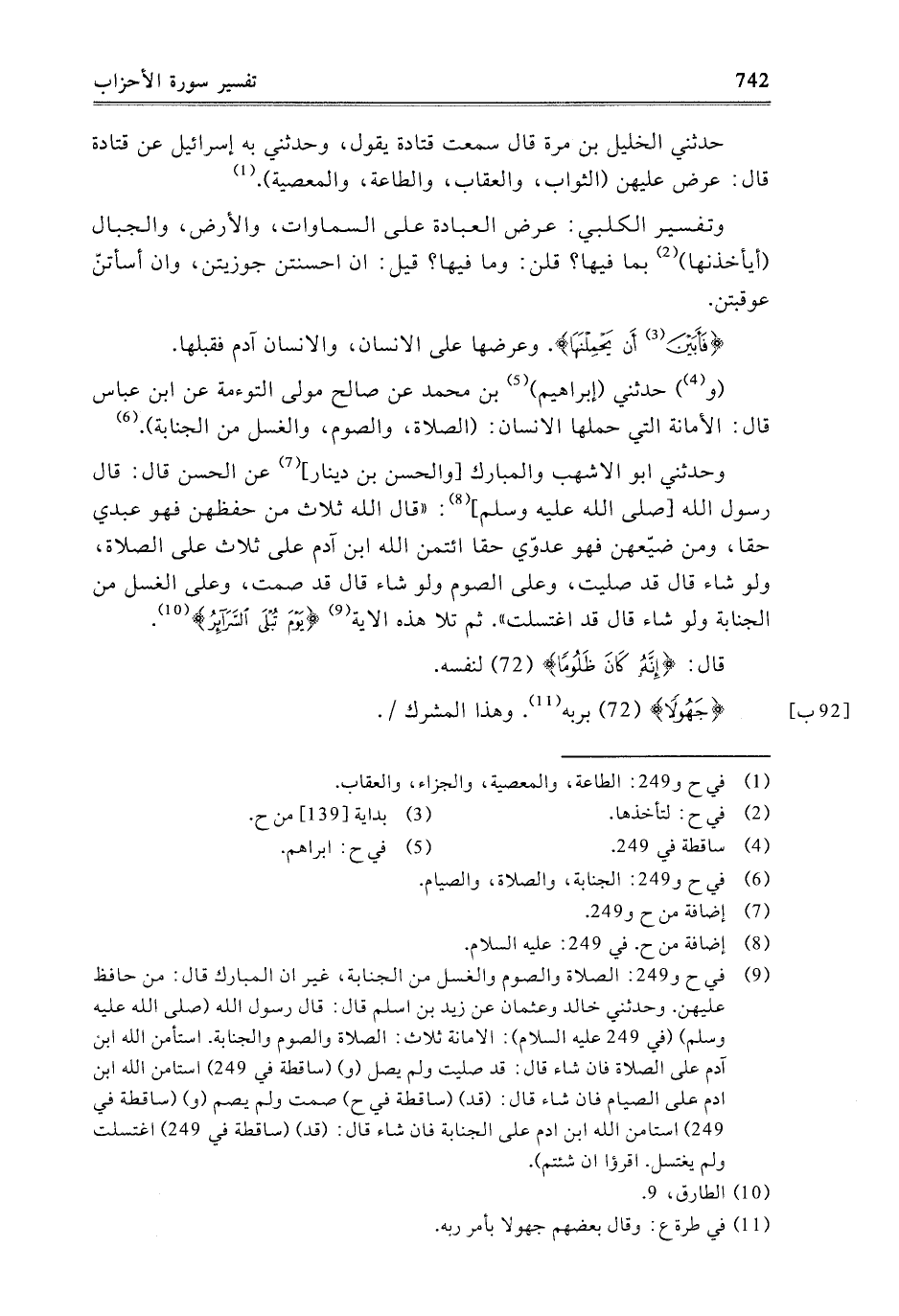 - وَحَدَّثَنِي إِبْرَاهِيمُ بْنُ مُحَمَّدٍ، عَنْ صَالِحٍ مَوْلَى التَّوْءَمَةِ، عَنِ ابْنِ عَبَّاسٍ، قَالَ: الأَمَانَةُ الَّتِي حَمَلَهَا الإِنْسَانُ: الصَّلاةُ، وَالصَّوْمُ، وَالْغُسْلُ مِنَ الْجَنَابَةِ.