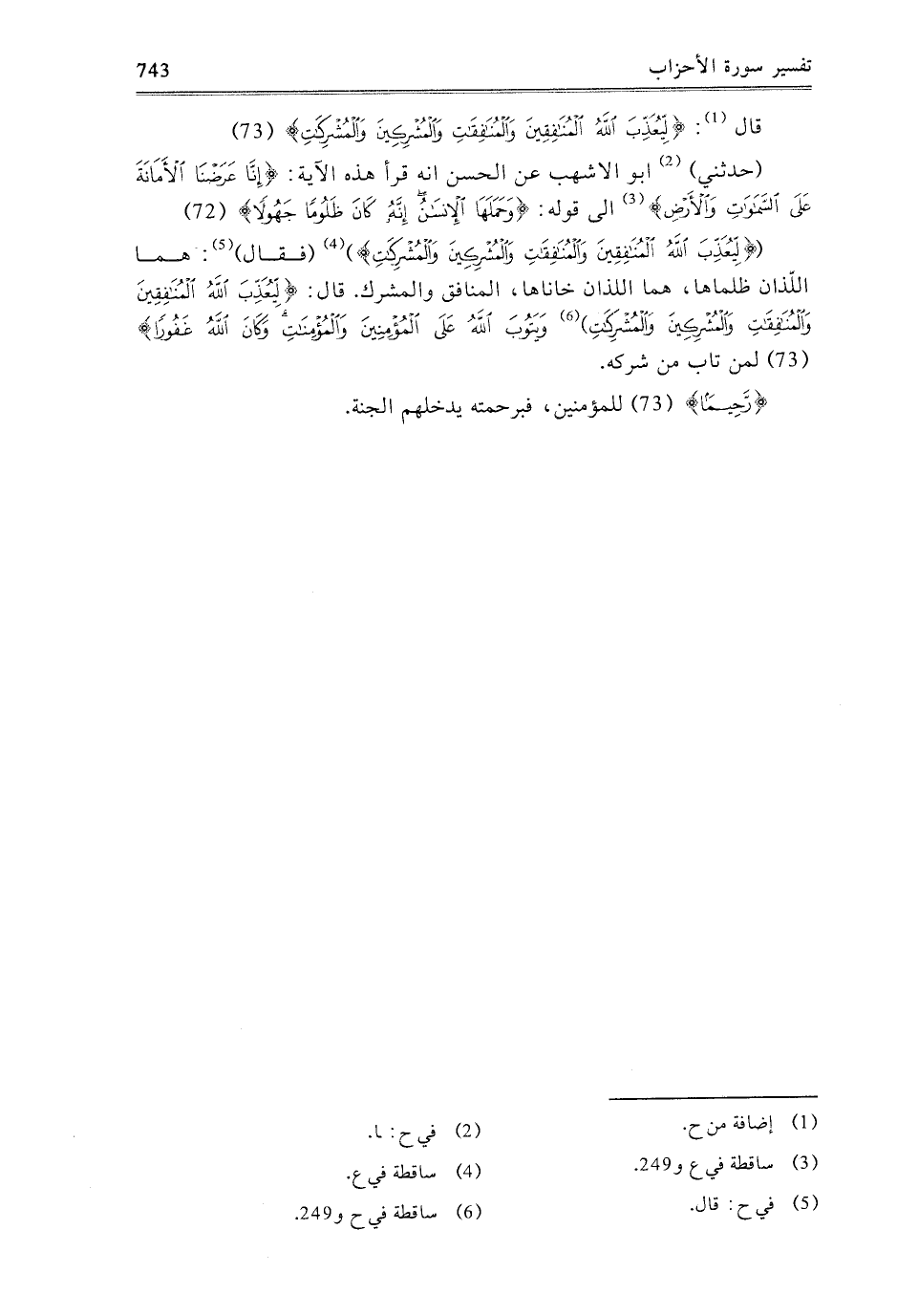 قَالَ: {لِيُعَذِّبَ اللَّهُ الْمُنَافِقِينَ وَالْمُنَافِقَاتِ وَالْمُشْرِكِينَ وَالْمُشْرِكَاتِ} [الأحزاب: 73]