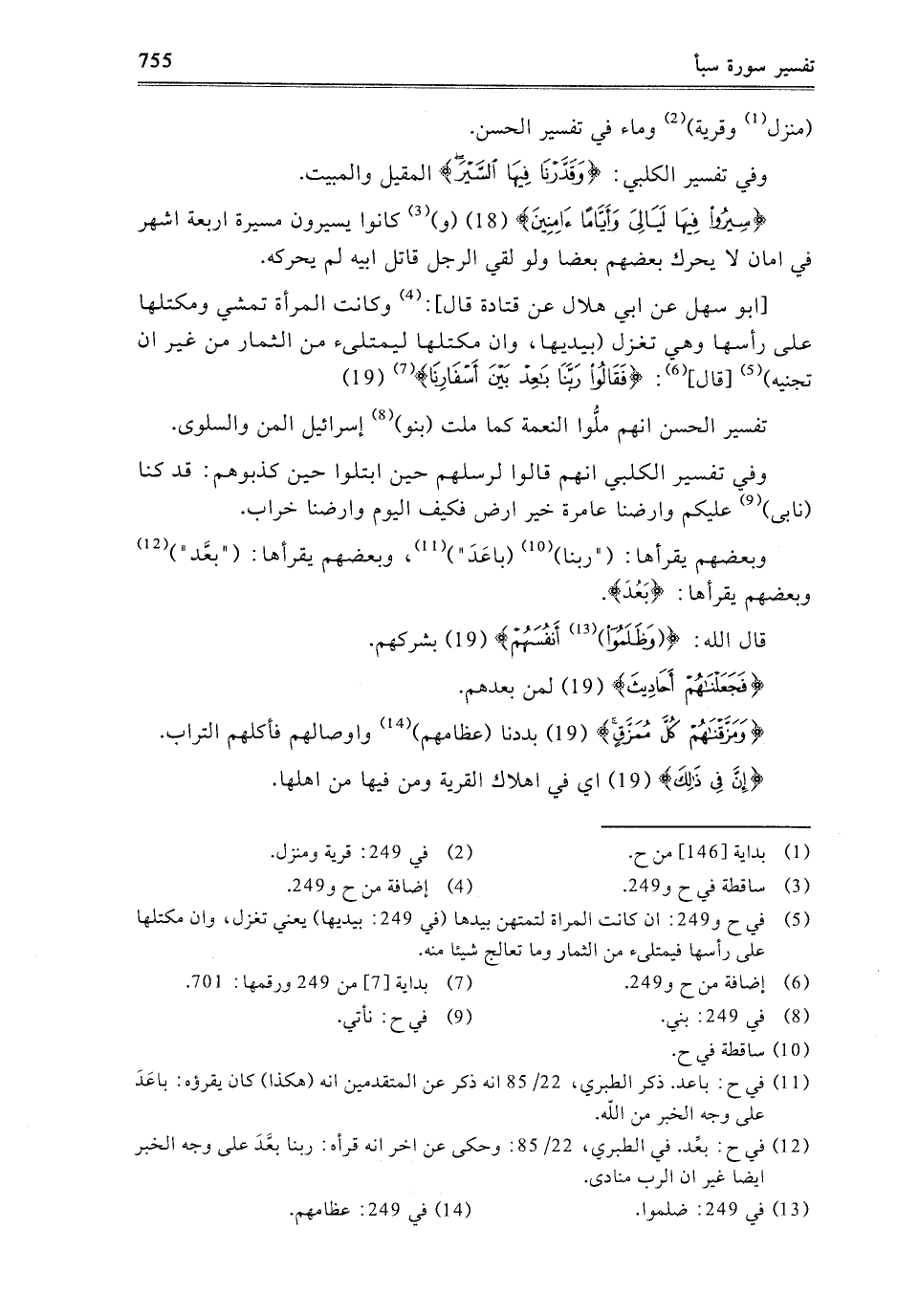 أَبُو سَهْلٍ، عَنْ أَبِي هِلالٍ، عَنْ قَتَادَةَ، قَالَ: وَكَانَتِ الْمَرْأَةُ تَمْشِي وَمِكْتَلُهَا عَلَى رَأْسِهَا، وَهِيَ تَغْزِلُ بِيَدَيْهَا، وَإِنَّ مِكْتَلَهَا لَيَمْتَلِئُ مِنَ الثِّمَارِ مِنْ غَيْرِ أَنْ تَجْنِيَهُ قَالَ: {فَقَالُوا رَبَّنَا بَاعِدْ بَيْنَ أَسْفَارِنَا} [سبأ: 19] تَفْسِيرُ الْحَسَنِ: إِنَّهُمْ مَلُّوا النِّعْمَةَ كَمَا مَلَّتْ بَنُو إِسْرَائِيلَ الْمَنَّ وَالسَّلْوَى.