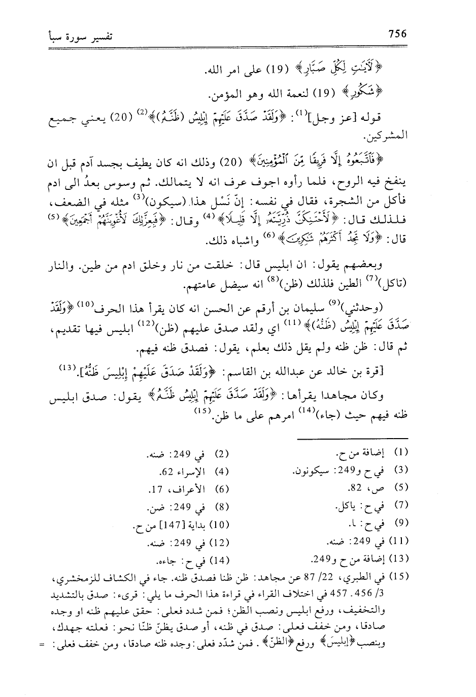 {فَاتَّبَعُوهُ إِلا فَرِيقًا مِنَ الْمُؤْمِنِينَ} [سبأ: 20] وَذَلِكَ أَنَّهُ كَانَ يُطِيفُ بِجَسَدِ آدَمَ قَبْلَ أَنْ يُنْفَخَ فِيهِ الرُّوحُ، فَلَمَّا رَأَوْهُ أَجْوَفَ عَرَفَ أَنَّهُ لا يَتَمَالَكُ، ثُمَّ وَسْوَسَ بَعْدُ إِلَى آدَمَ، فَأَكَلَ مِنَ الشَّجَرَةِ، فَقَالَ فِي نَفْسِهِ: إِنَّ نَسْلَ هَذَا سَيَكُونُ مِثْلَهُ فِي الضَّعْفِ، فَلِذَلِكَ قَالَ: {لأَحْتَنِكَنَّ ذُرِّيَّتَهُ إِلا قَلِيلا} [الإسراء: 62] وَقَالَ: {فَبِعِزَّتِكَ لأُغْوِيَنَّهُمْ أَجْمَعِينَ} [ص: 82] قَالَ: {وَلا تَجِدُ أَكْثَرَهُمْ شَاكِرِينَ} [الأعراف: 17] وَأَشْبَاهَ