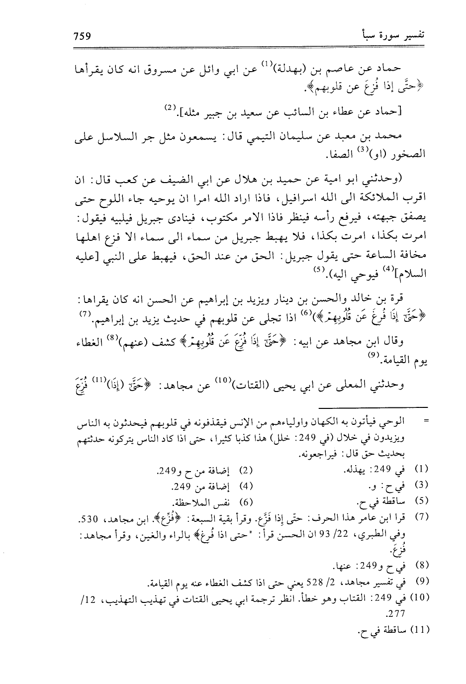 قُرَّةُ بْنُ خَالِدٍ، وَالْحَسَنُ بْنُ دِينَارٍ، وَيَزِيدُ بْنُ إِبْرَاهِيمَ، عَنِ الْحَسَنِ أَنَّهُ كَانَ يَقْرَأُهَا: حَتَّى إِذَا فُزِعَ عَن قُلُوبِهِمْ إِذَا تَجَلَّى عَنْ قُلُوبِهِمْ فِي حَدِيثِ يَزِيدَ بْنِ إِبْرَاهِيمَ.