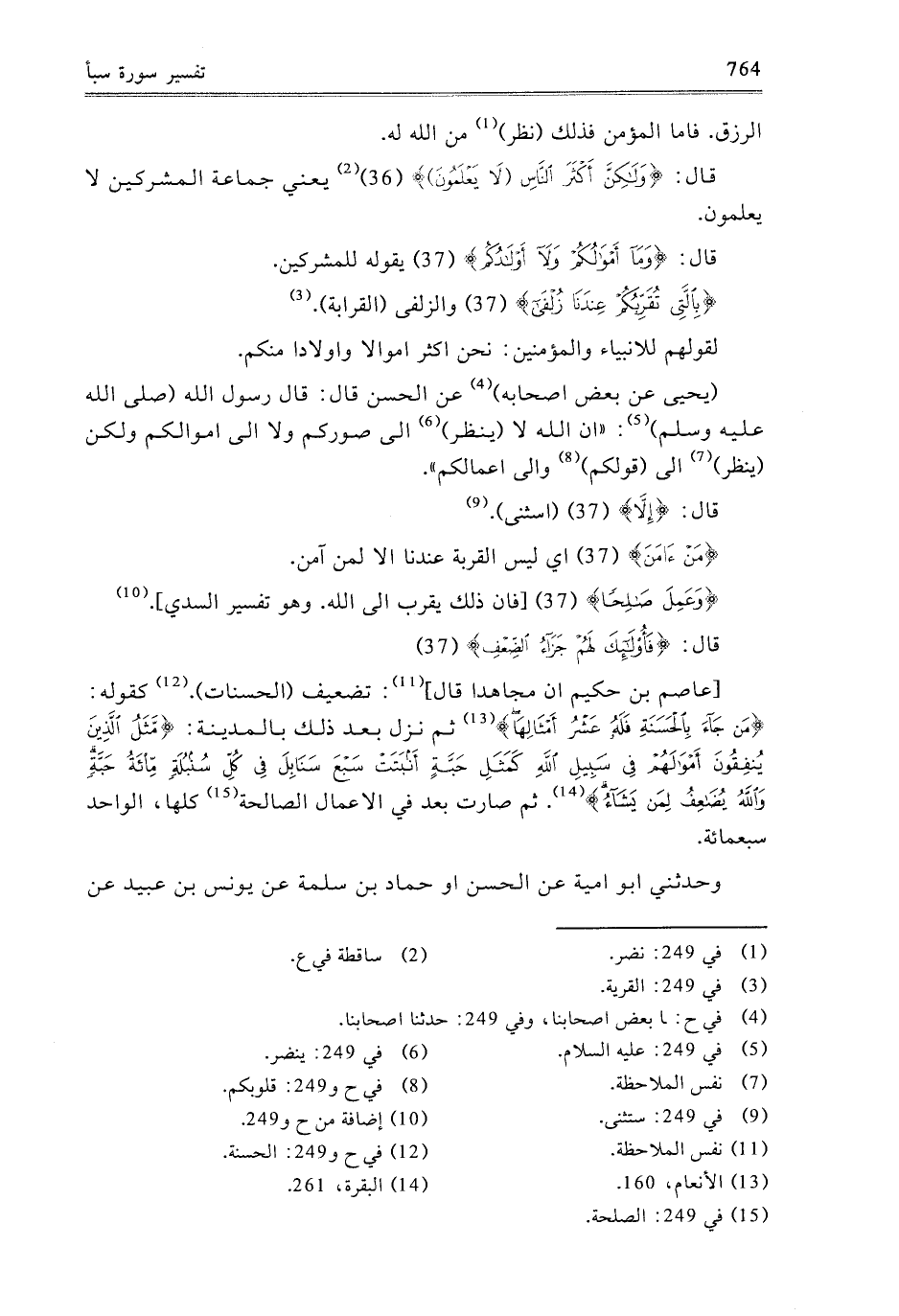 قَالَ: {فَأُولَئِكَ لَهُمْ جَزَاءُ الضِّعْفِ} [سبأ: 37] عَاصِمُ بْنُ حَكِيمٍ أَنَّ مُجَاهِدًا قَالَ: تَضْعِيفُ الْحَسَنَاتِ، كَقَوْلِهِ: {مَنْ جَاءَ بِالْحَسَنَةِ فَلَهُ عَشْرُ أَمْثَالِهَا} [الأنعام: 160] ثُمَّ نَزَلَ بَعْدَ ذَلِكَ بِالْمَدِينَةِ {مَثَلُ الَّذِينَ يُنْفِقُونَ أَمْوَالَهُمْ فِي سَبِيلِ اللَّهِ كَمَثَلِ حَبَّةٍ أَنْبَتَتْ سَبْعَ سَنَابِلَ فِي كُلِّ سُنْبُلَةٍ مِائَةُ حَبَّةٍ وَاللَّهُ يُضَاعِفُ لِمَنْ يَشَاءُ} [البقرة: 261] ثُمَّ صَارَتْ بَعْدُ فِي الأَعْمَالِ الصَّالِحَةِ كُلِّهَا، الْوَاحِدُ سَبْعُ مِائَةٍ.