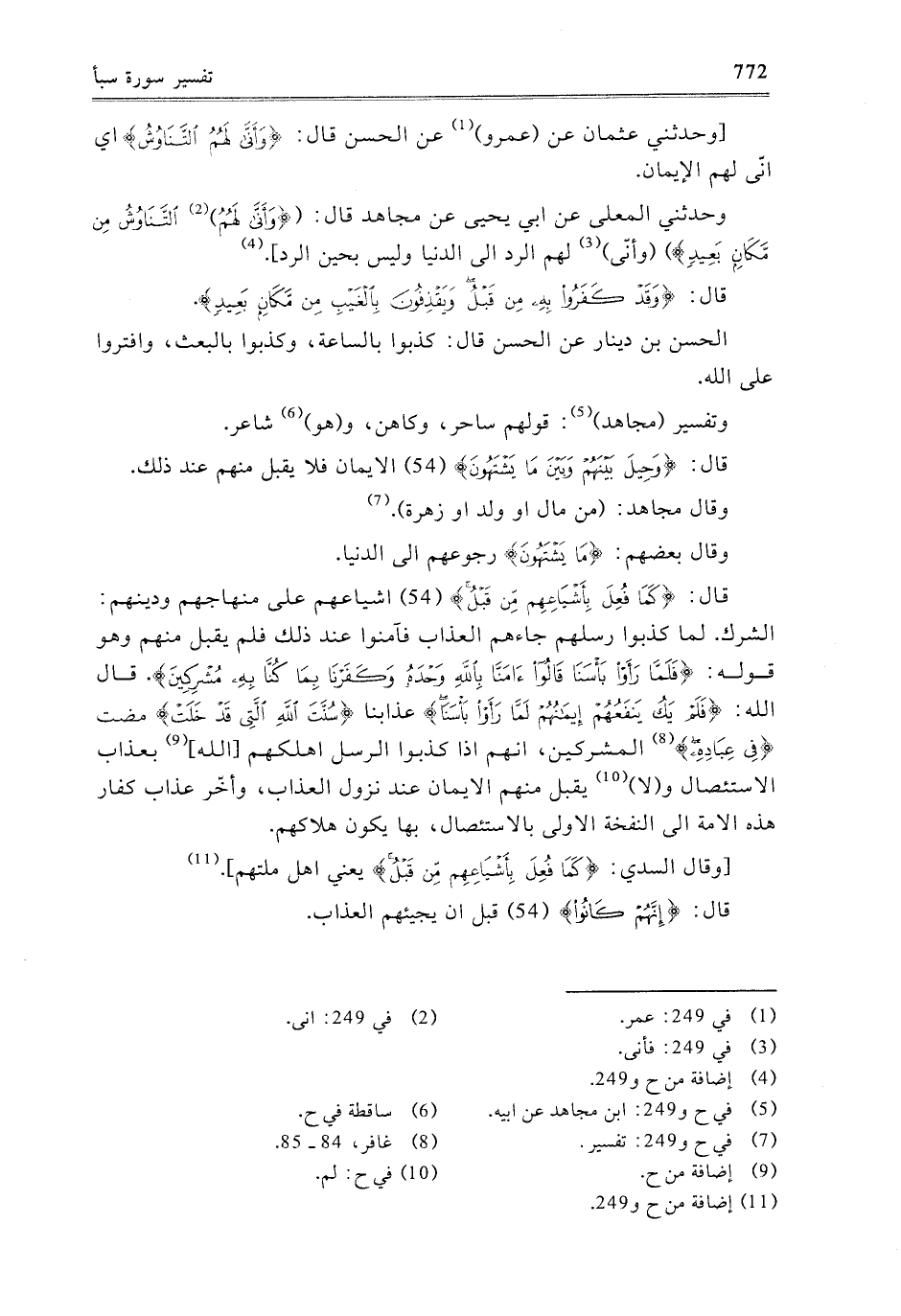 قَالَ: {كَمَا فُعِلَ بِأَشْيَاعِهِمْ مِنْ قَبْلُ} [سبأ: 54] أَشْيَاعُهُمْ عَلَى مِنْهَاجِهِمْ وَدِينِهِمُ الشِّرْكُ لَمَّا كَذَّبُوا رُسُلَهُمْ جَاءَهُمُ الْعَذَابُ، فَآمَنُوا عِنْدَ ذَلِكَ، فَلَمْ يُقْبَلْ مِنْهُمْ، وَهُوَ قَوْلُهُ: {فَلَمَّا رَأَوْا بَأْسَنَا قَالُوا آمَنَّا بِاللَّهِ وَحْدَهُ وَكَفَرْنَا بِمَا كُنَّا بِهِ مُشْرِكِينَ} [غافر: 84] قَالَ اللَّهُ: {فَلَمْ يَكُ يَنْفَعُهُمْ إِيمَانُهُمْ لَمَّا رَأَوْا بَأْسَنَا} [غافر: 85] عَذَابَنَا {سُنَّةَ اللَّهِ الَّتِي قَدْ خَلَتْ} [غافر: 85] مَضَتْ {فِي عِبَادِهِ} [غافر: 85]